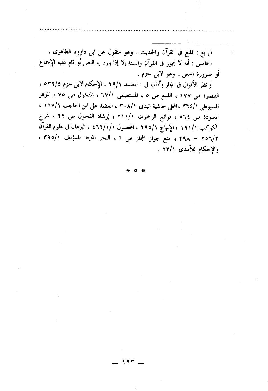 الخامس: أنه لا يجوز فى القرآن والسنة إلا إذا ورد به النص أو قام عليه الإجماع أو ضرورة الحس. وهو لابن حزم.