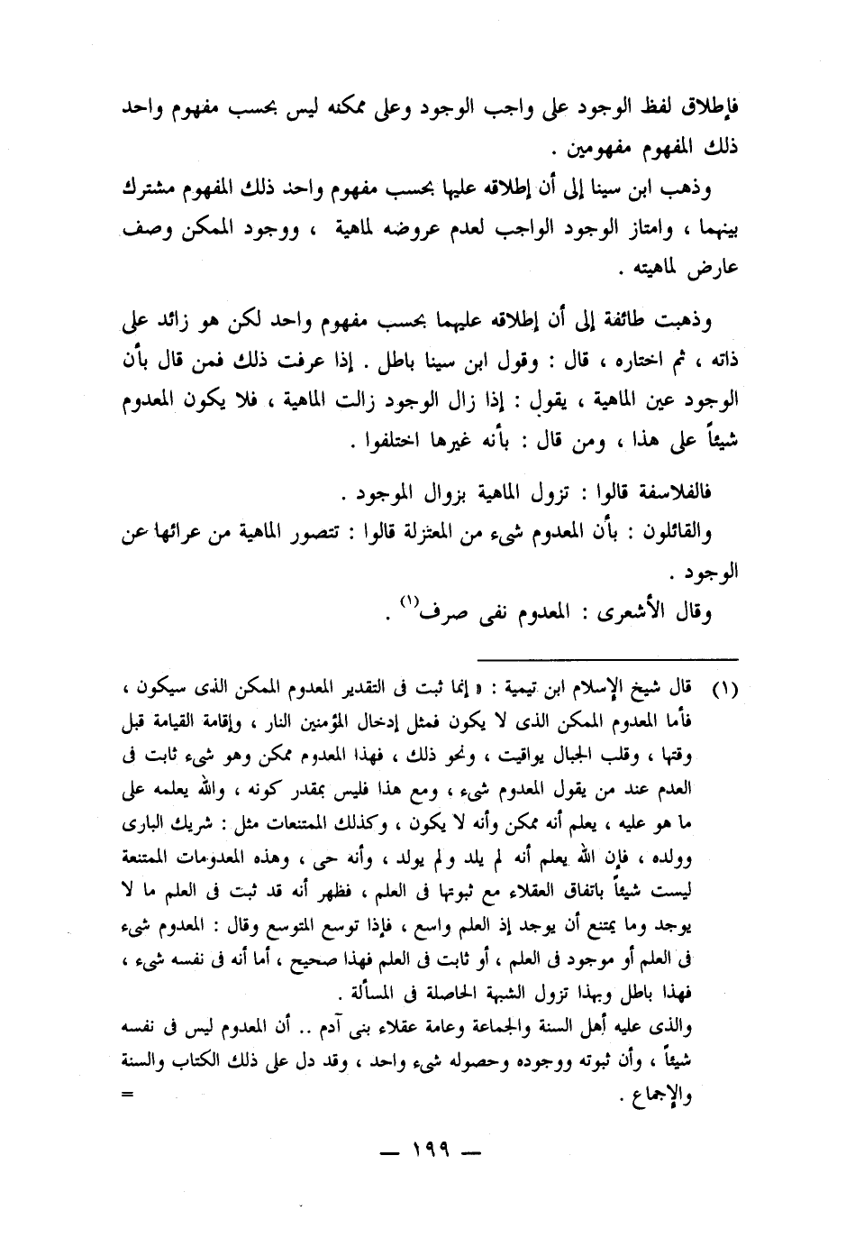 والذى عليه أهل السنة والجماعة وعامة عقلاء بنى آدم. . أن المعدوم ليس فى نفسه شيئًا، وأن ثبوته ووجوده وحصوله شىء واحد، وقد دل على ذلك الكتاب والسنة والإجماع. =