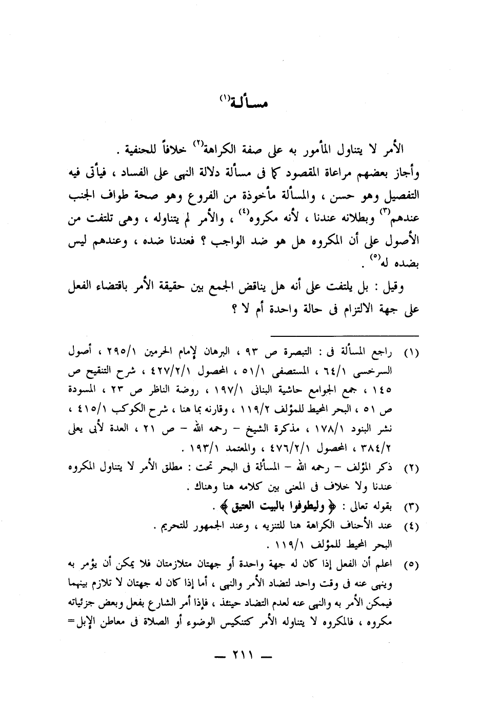 (٢) ذكر المؤلف -رحمه اللَّه- المسألة فى البحر تحت: مطلق الأمر لا يتناول المكروه عندنا ولا خلاف فى المعنى بين كلامه هنا وهناك.