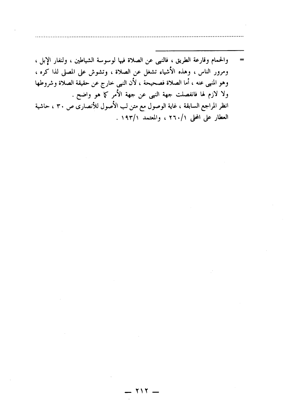 = والحمام وقارعة الطريق، فالنهى عن الصلاة فيا لوسوسة الشياطين، ولنفار الإبل، ومرور الناس، وهذه الأشياء تشغل عن الصلاة، وتشوش على المصلى لذا كره، وهو المنهى عنه، أما الصلاة فصحيحة، لأن النهى خارج عن حقيقة الصلاة وشروطها ولا لازم لها فانفصلت جهة النهى عن جهة الأمر كما هو واضح.