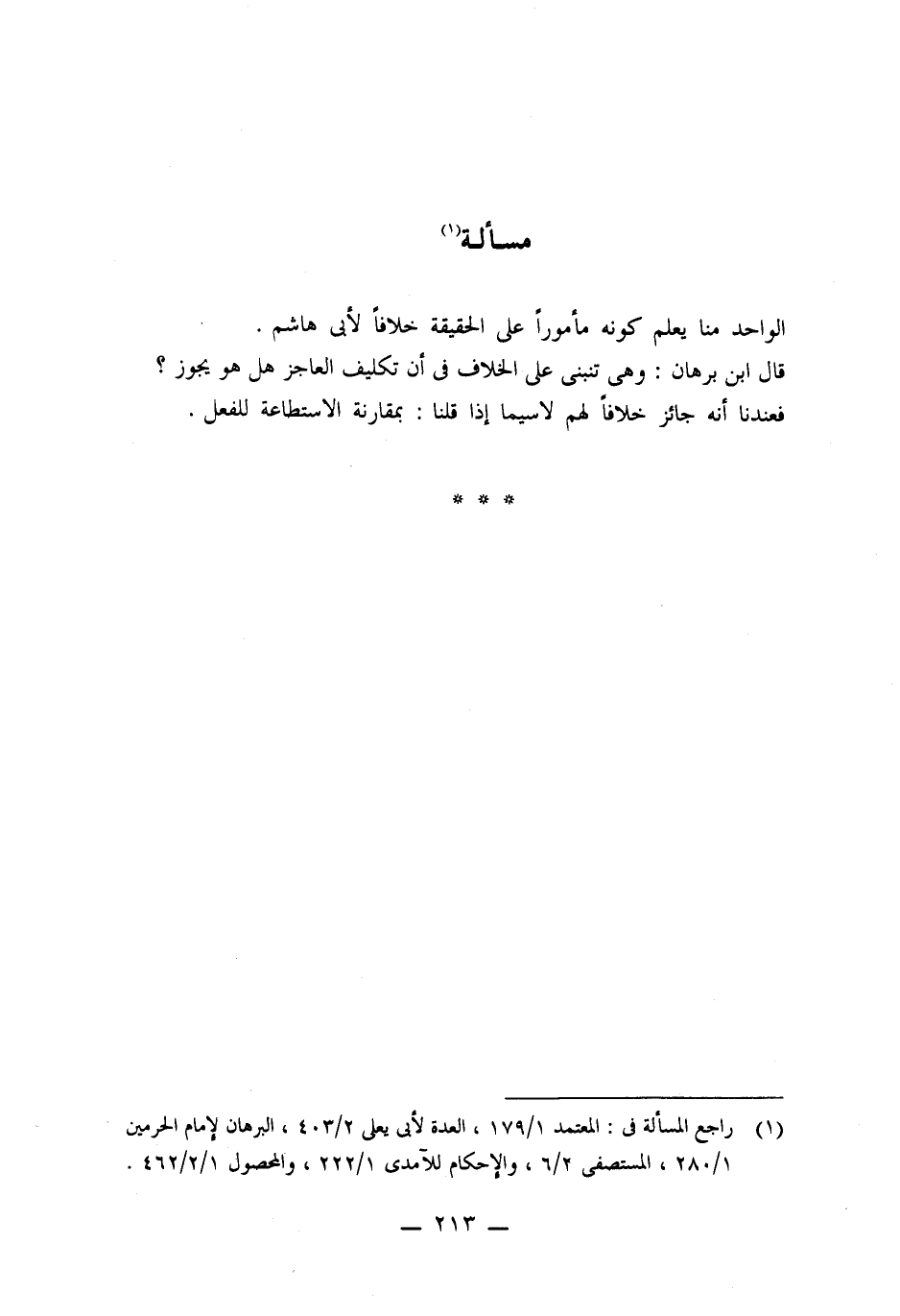 (١) راجع المسألة فى: المعتمد ١/ ١٧٩، العدة لأبى يعلى ٢/ ٤٠٣، البرهان لإمام الحرمين ١/ ٢٨٠، المستصفى ٢/ ٦، والإحكام للآمدى ١/ ٢٢٢، والمحصول ١/ ٢/ ٤٦٢.