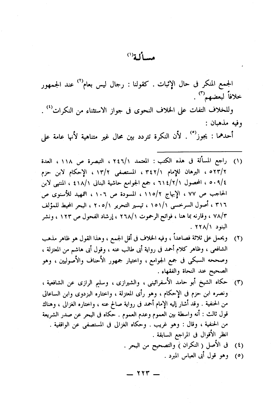 (١) راجع المسألة فى هذه الكتب: المعتمد ١/ ٢٤٦، التبصرة ص ١١٨، العدة ٢/ ٥٢٣، البرهان للإمام ١/ ٣٤٢، المستصفى ٢/ ١٣، الإحكام لابن حزم ٤/ ٥٠٩، المحصول ١/ ٢/ ٦١٤، جمع الجوامع حاشية البنانى ١/ ٤١٨، المنتهى لابن الحاجب ص ٧٧، الإبهاج ٢/ ١١٥، المسودة ص ١٠٦، التمهيد للأسنوى ص ٣١٦، أصول السرخسى ١/ ١٥١، تيسير التحرير ١/ ٢٠٥، البحر المحيط للمؤلف ٣/ ٧٨، وقارنه بما هنا، فواتح الرحموت ١/ ٢٦٨، إرشاد الفحول ص ١٢٣، ونشر البنود ١/ ٢٢٨.