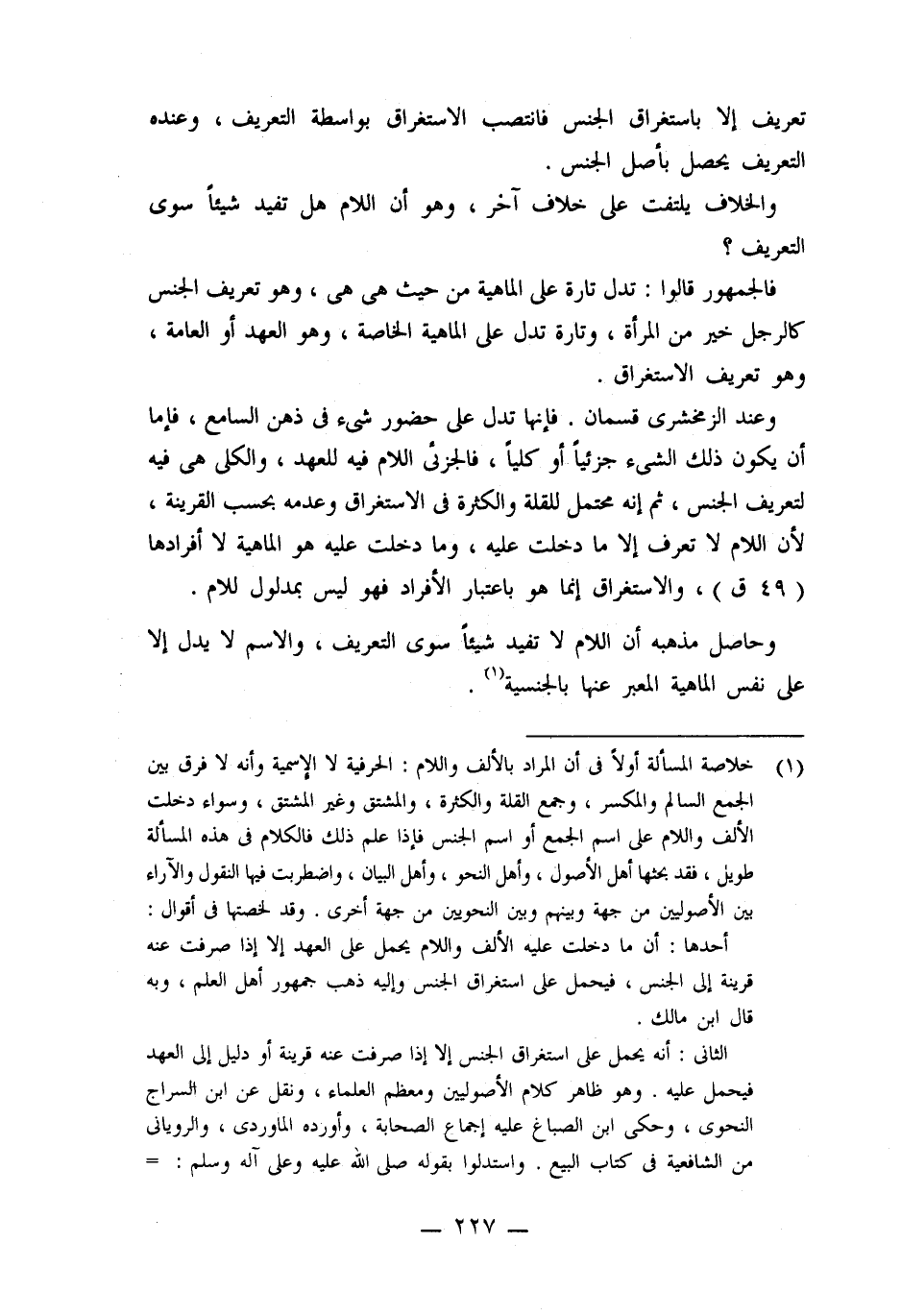 (١) خلاصة المسألة أولًا فى أن المراد بالألف واللام: الحرفية لا الإسمية وأنه لا فرق بين الجمع السالم والمكسر، وجمع القلة والكثرة، والمشتق وغير المشتق، وسواء دخلت الألف واللام على اسم الجمع أو اسم الجنس فإذا علم ذلك فالكلام فى هذه المسألة طويل، فقد بحثها أهل الأصول، وأهل النحو، وأهل البيان، واضطربت فيها النقول والآراء بين الأصوليين من جهة وبينهم وبين النحويين من جهة أخرى. وقد لخصتها فى أقوال: