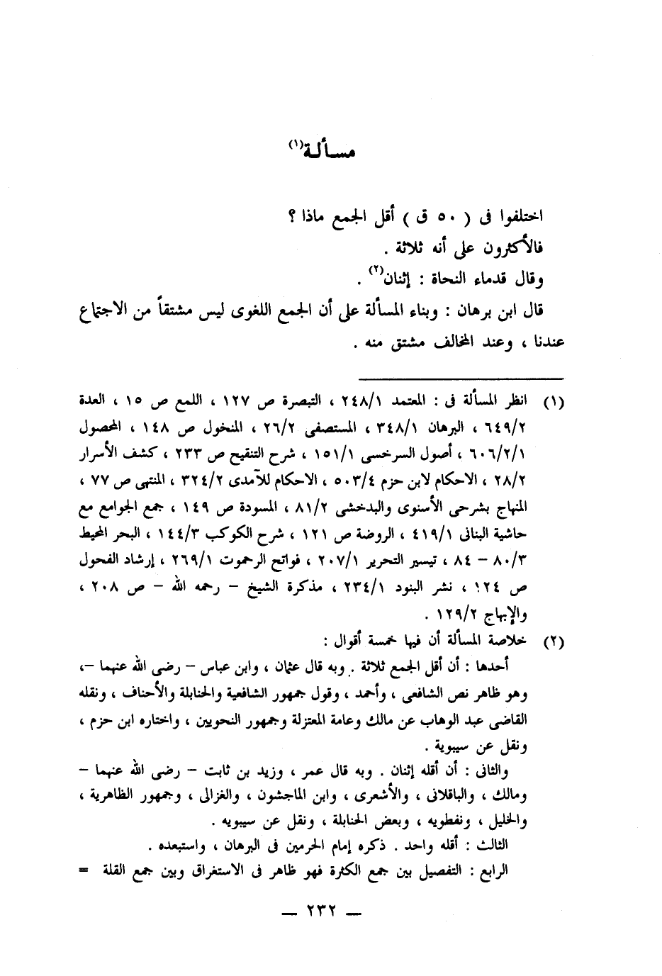 أحدها: أن أقل الجمع ثلاثة. وبه قال عثمان، وابن عباس -رضى اللَّه عنهما-، وهو ظاهر نص الشافعى، وأحمد، وقول جمهور الشافعية والحنابلة والأحناف، ونقله القاضى عبد الوهاب عن مالك وعامة المعتزلة وجمهور النحويين، واختاره ابن حزم، ونقل عن سيبوية.
