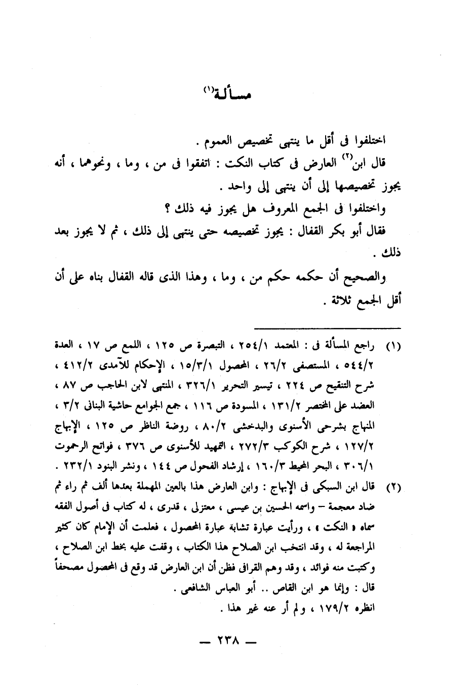 (١) راجع المسألة فى: المعتمد ١/ ٢٥٤، التبصرة ص ١٢٥، اللمع ص ١٧، العدة ٢/ ٥٤٤، المستصفى ٢/ ٢٦، المحصول ١/ ٣/ ١٥، الإحكام للآمدى ٢/ ٤١٢، شرح التنقيح ص ٢٢٤، تيسير التحرير ١/ ٣٢٦، المنتهى لابن الحاجب ص ٨٧، العضد على المختصر ٢/ ١٣١، المسودة ص ١١٦، جمع الجوامع حاشية النبانى ٢/ ٣، المنهاج بشرحى الأسنوى والبدخشى ٢/ ٨٠، روضة الناظر ص ١٢٥، الإبهاج ٢/ ١٢٧، شرح الكوكب ٣/ ٢٧٢، التمهيد للأسنوى ص ٣٧٦، فواتح الرحموت ١/ ٣٠٦، البحر المحيط ٣/ ١٦٠، إرشاد الفحول ص ١٤٤، ونشر البنود ١/ ٢٣٢.