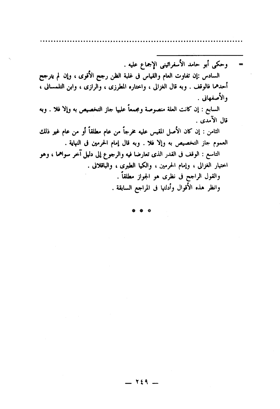 الثامن: إن كان الأصل المقيس عليه مخرجًا من عام مطلقًا أو من عام غير ذلك العموم جاز التخصيص به وإلا فلا. وبه قال إمام الحرمين فى النهاية.