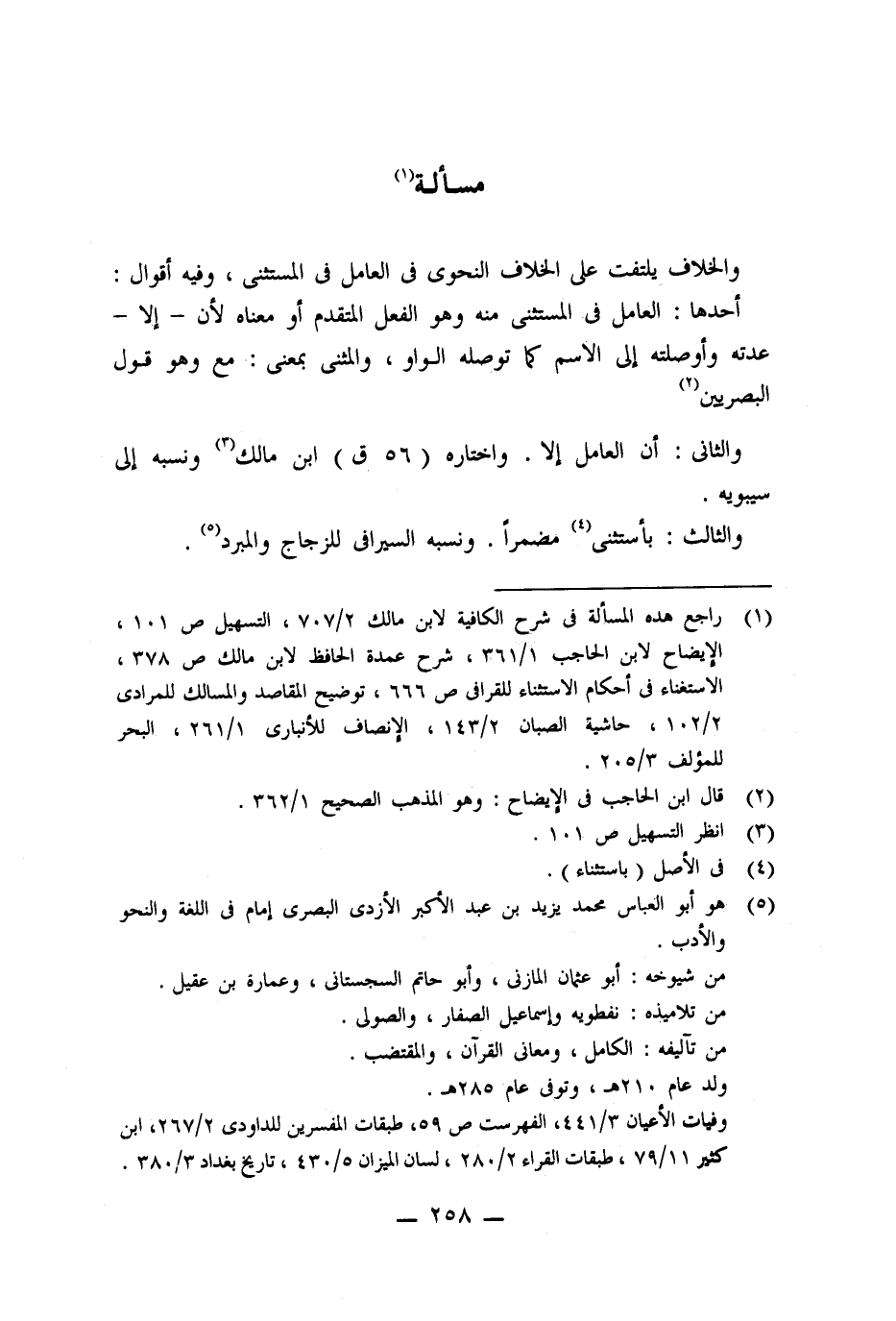 (١) راجع هذه المسألة فى شرح الكافية لابن مالك ٢/ ٧٠٧، التسهيل ص ١٠١، الإيضاح لابن الحاجب ١/ ٣٦١، شرح عمدة الحافظ لابن مالك ص ٣٧٨، الاستغناء فى أحكام الاستثناء للقرافى ص ٦٦٦، توضيح المقاصد والمسالك للمرادى ٢/ ١٠٢، حاشية الصبان ٢/ ١٤٣، الإنصاف للأنبارى ١/ ٢٦١، البحر للمؤلف ٣/ ٢٠٥.
