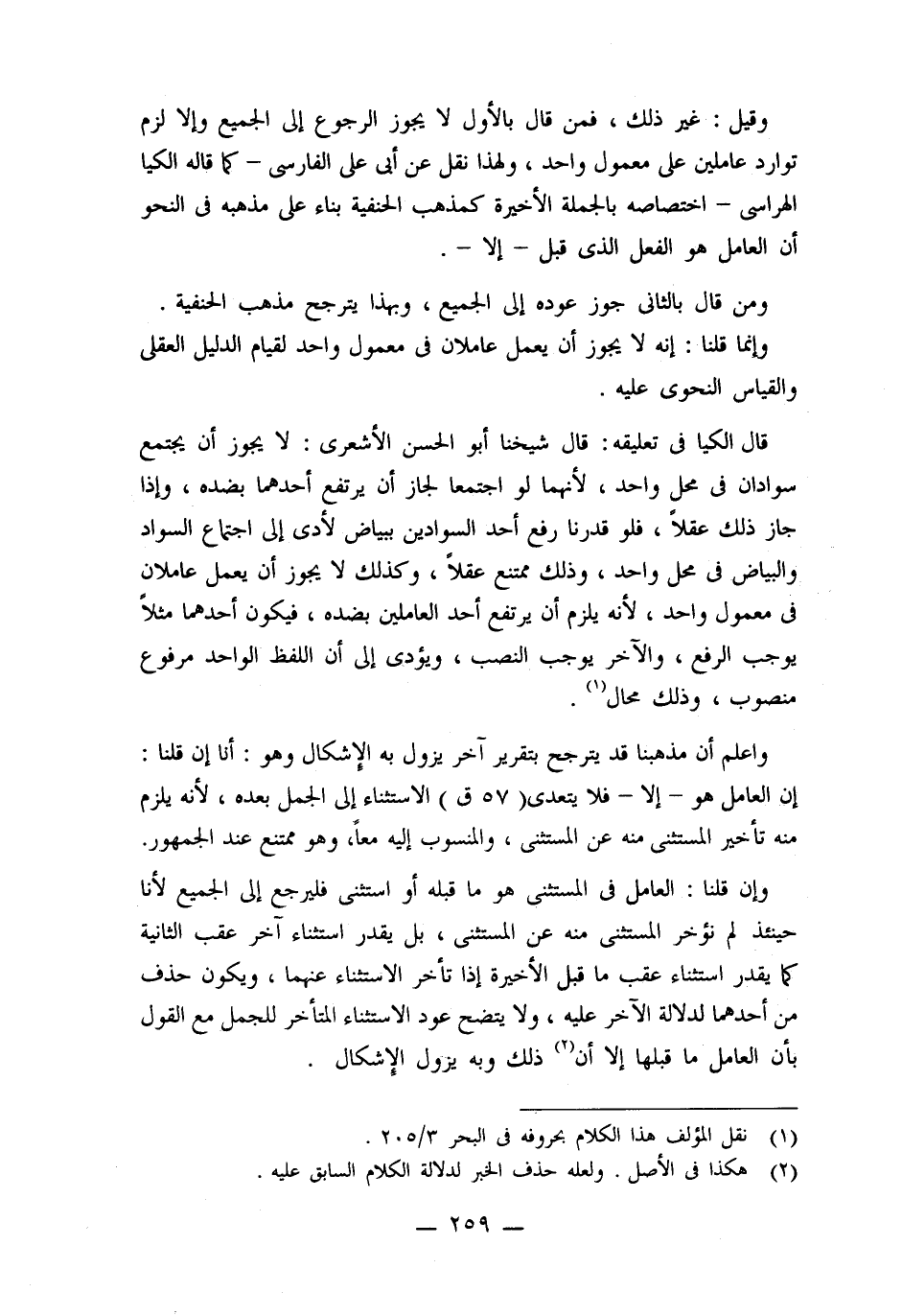 وقيل: غير ذلك، فمن قال بالأول لا يجوز الرجوع إلى الجميع وإلا لزم توارد عاملين على معمول واحد، ولهذا نقل عن أبى على الفارسى -كما قاله الكيا الهراسى- اختصاصه بالجملة الأخيرة كمذهب الحنفية بناء على مذهبه فى النحو أن العامل هو الفعل الذى قبل -إلا-.