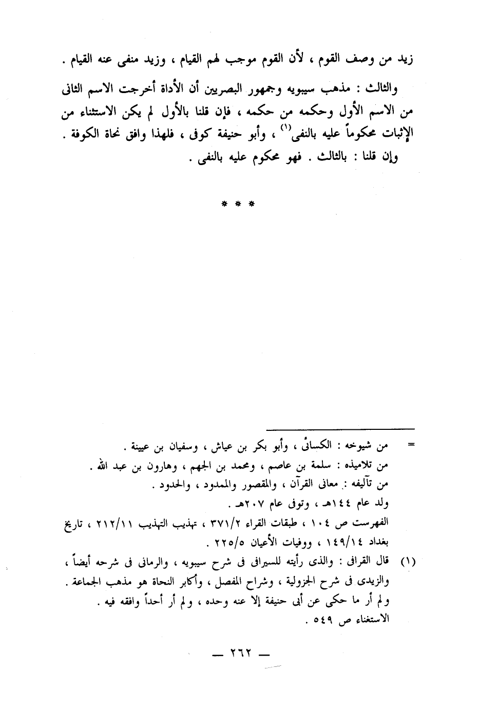 (١) قال القرافى: والذى رأيته للسيرافى فى شرح سيبويه، والرمانى فى شرحه أيضًا، والزيدى فى شرح الجزولية، وشراح المفصل، وأكابر النحاة هو مذهب الجماعة. ولم أر ما حكى عن أبى حنيفة إلا عنه وحده، ولم أر أحدًا وافقه فيه.