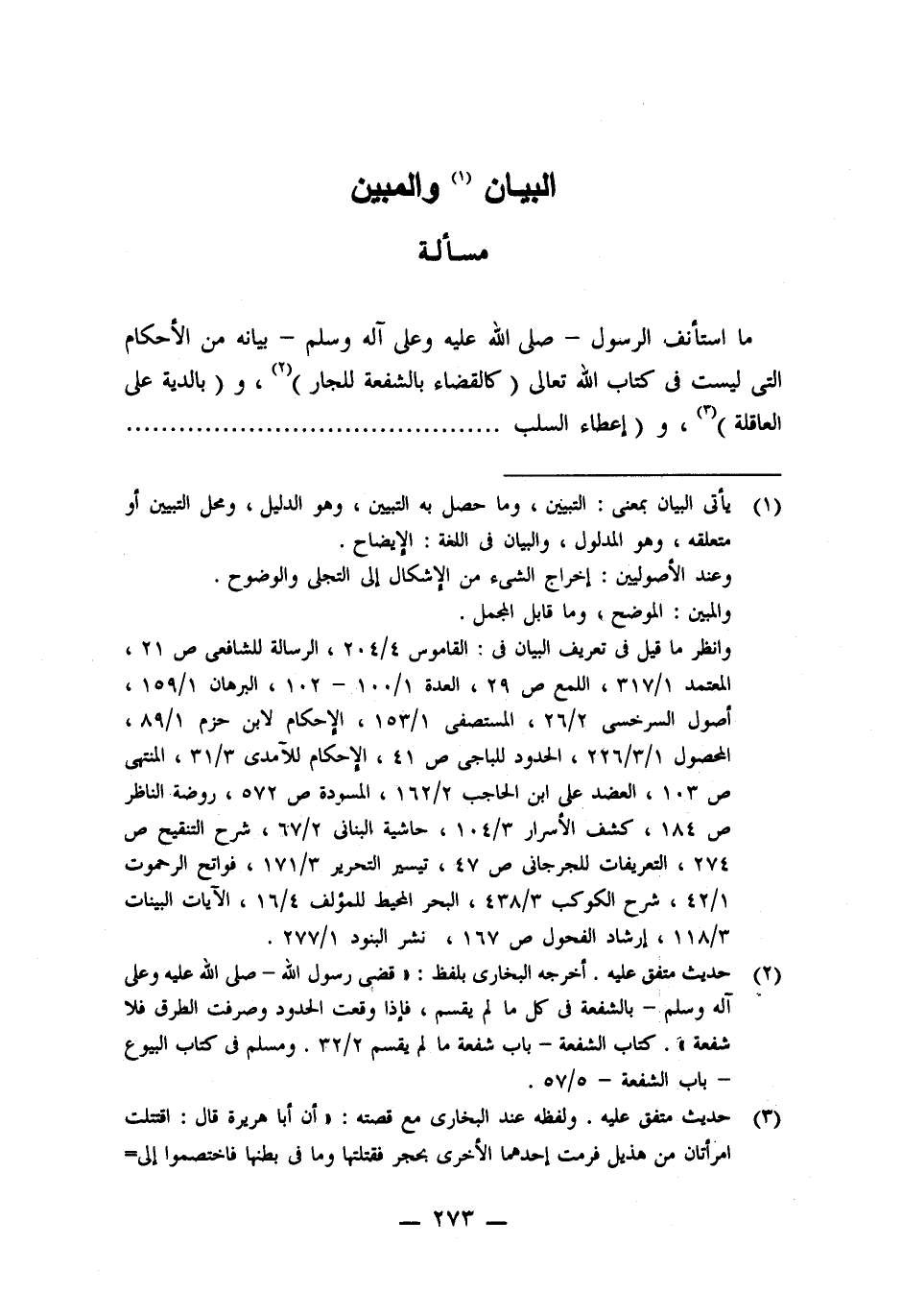 ما استأنف الرسول -صلى اللَّه عليه وعلى آله وسلم- بيانه من الأحكام التى ليست فى كتاب اللَّه تعالى (كالقضاء بالشفعة للجار) (٢)، و (بالدية على العاقلة) (٣)، و (إعطاء السلب. . . . . .