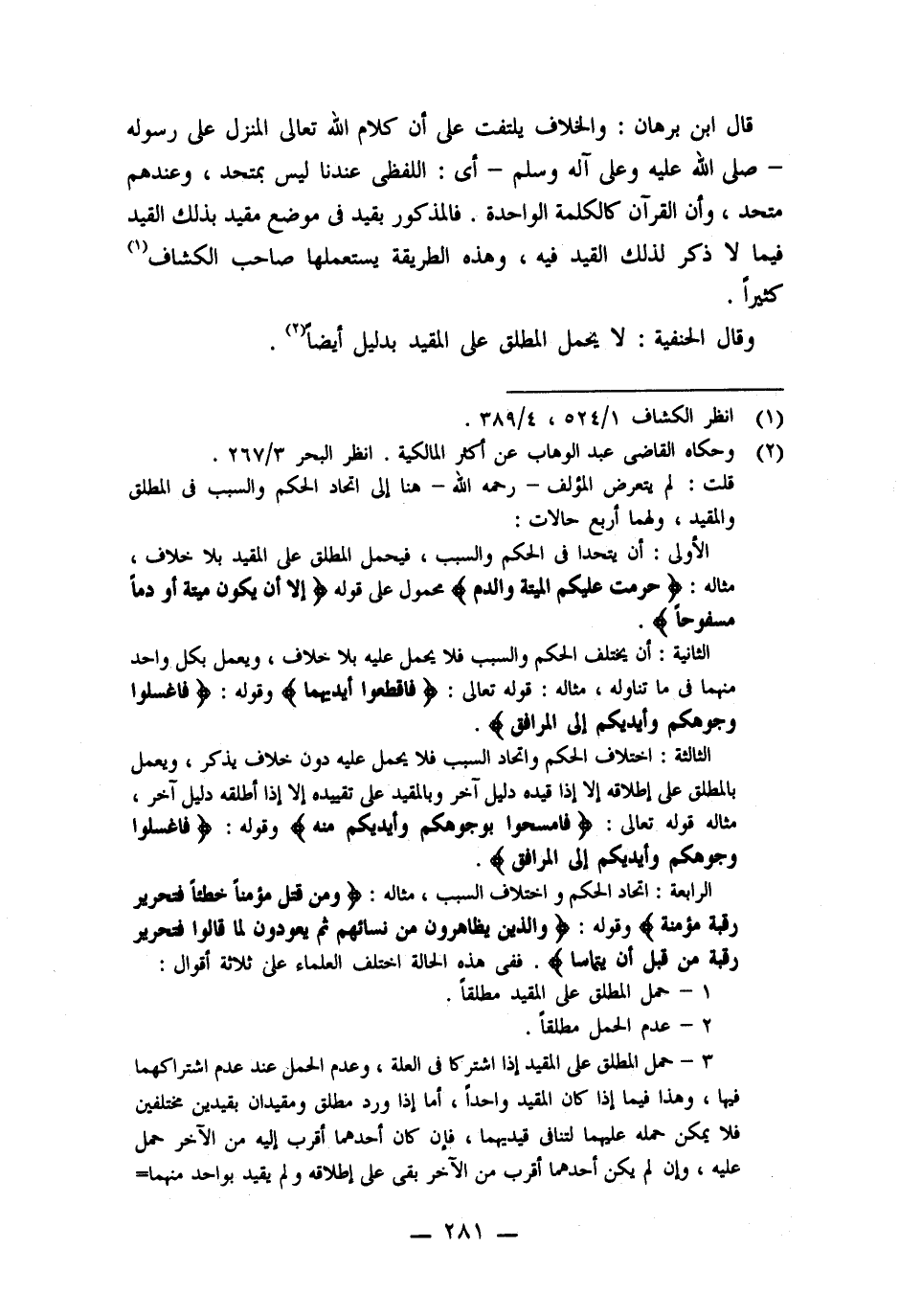 قال ابن برهان: والخلاف يلتفت على أن كلام اللَّه تعالى المنزل على رسوله -صلى اللَّه عليه وعلى آله وسلم- أى: اللفظى عندنا ليس بمتحد، وعندهم متحد، وأن القرآن كالكلمة الواحدة. فالمذكور بقيد فى موضع مقيد بذلك القيد فيما لا ذكر لذلك القيد فيه، وهذه الطريقة يستعملها صاحب الكشاف (١) كثيرًا.