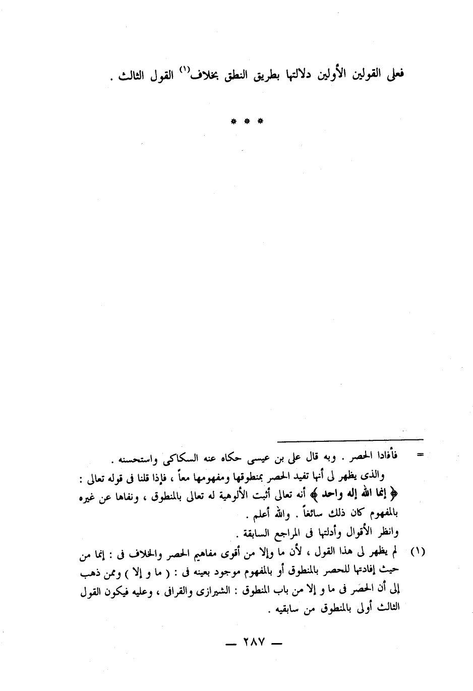 (١) لم يظهر لى هذا القول، لأن ما وإلا من أقوى مفاهيم الحصر والخلاف فى: إنما من حيث إفادتها للحصر بالمنطوق أو بالمفهوم موجود بعينه فى: (ما وإلا) وممن ذهب إلى أن الحصر فى ما وإلا من باب المنطوق: الشيرازى والقرافى، وعليه فيكون القول الثالث أولى بالمنطوق من سابقيه.