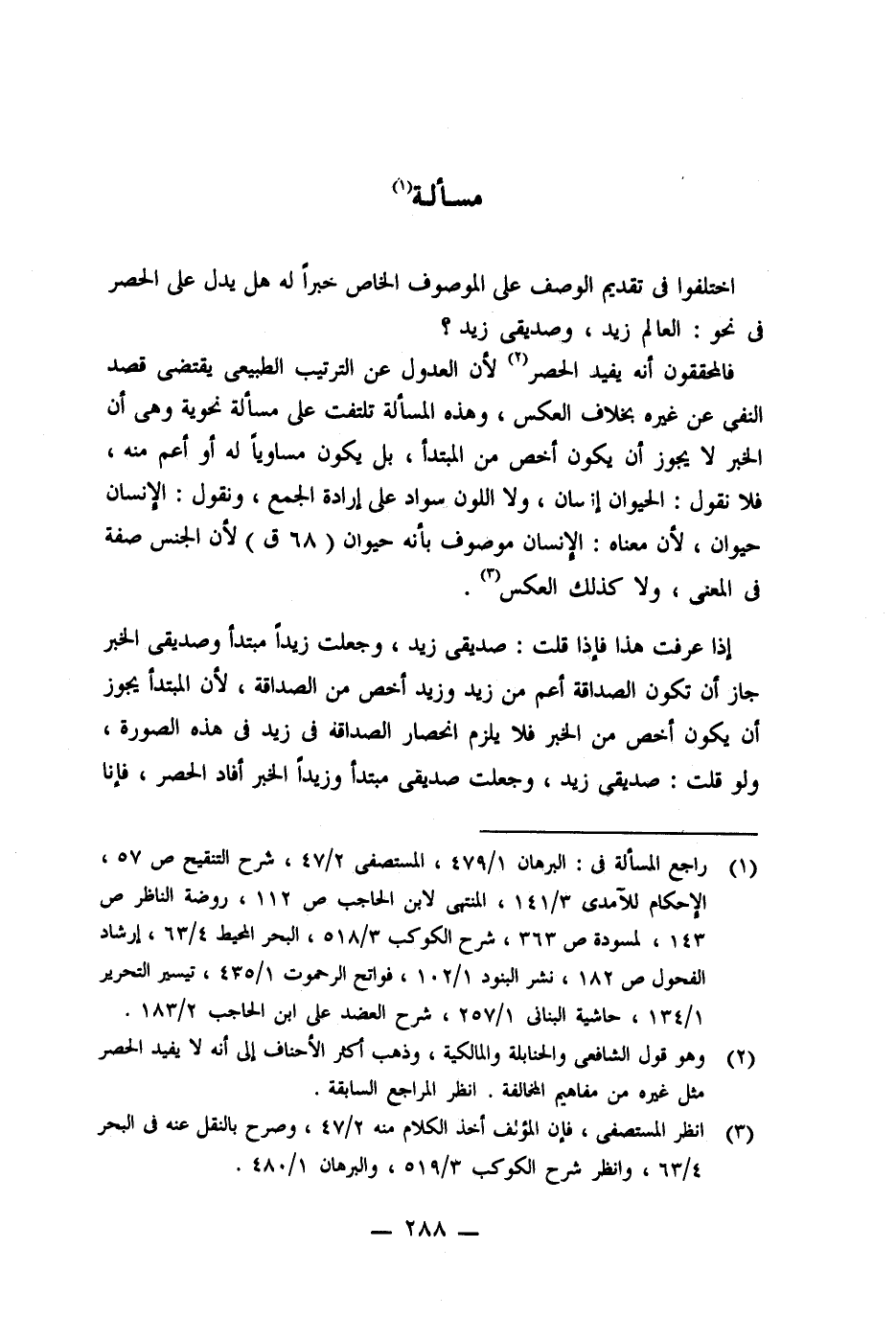 فالمحققون أنه يفيد الحصر (٢) لأن العدول عن الترتيب الطبيعى يقتضى قصد النفى عن غيره بخلاف العكس، وهذه المسألة تلتفت على مسألة نحوية وهى أن الخبر لا يجوز أن يكون أخص من المبتدأ، بل يكون مساويًا له أو أعم منه، فلا نقول: الحيوان إنسان، ولا اللون سواد على إرادة الجمع، ونقول: الإنسان حيوان، لأن معناه: الإنسان موصوف بأنه حيوان لأن الجنس صفة فى المعنى، ولا كذلك العكس (٣).
