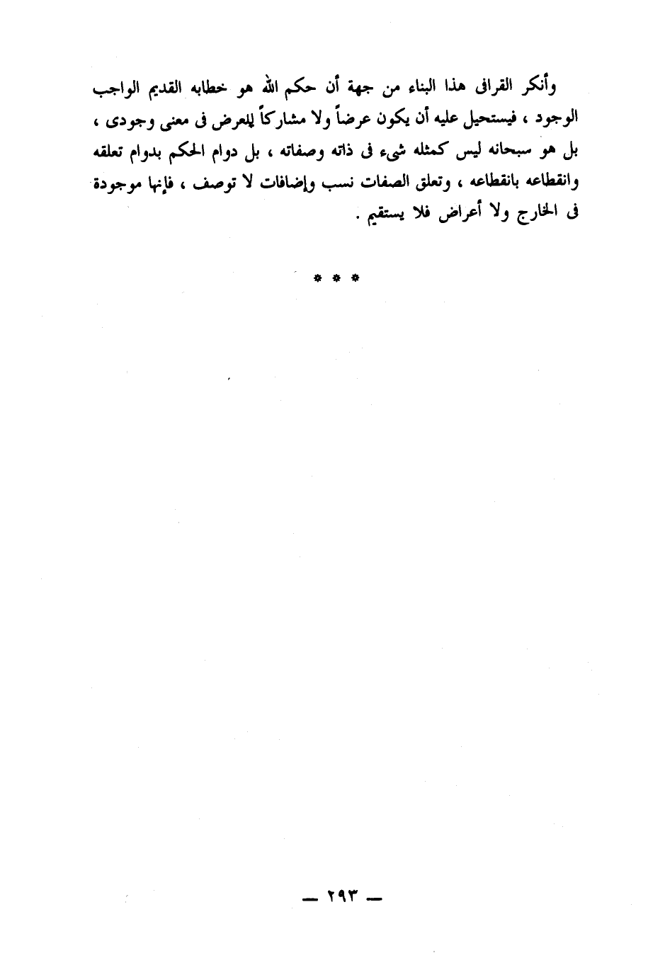 وأنكر القرافى هذا البناء من جهة أن حكم اللَّه هو خطابه القديم الواجب الوجود، فيستحيل عليه أن يكون عرضًا ولا مشاركًا للعرض فى معنى وجودى، بل هو سبحانه ليس كمثله شىء فى ذاته وصفاته، بل دوام الحكم بدوام تعلقه وانقطاعه بانقطاعه، وتعلق الصفات نسب وإضافات لا توصف، فإنها موجودة فى الخارج ولا أعراض فلا يستقيم.