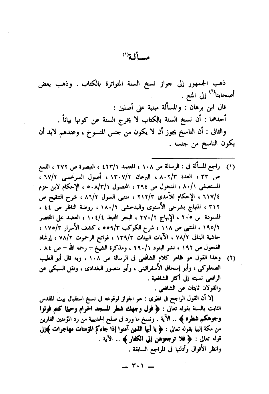 (١) راجع المسألة فى: الرسالة ص ١٠٨، المعتمد ١/ ٤٢٣، التبصرة ص ٢٧٢، اللمع ص، ٣٣، العدة ٣/ ٨٠٢، البرهان ٢/ ١٣٠٧، أصول السرخسى ٢/ ٦٧، المستصفى ١/ ٨٠، المنخول ص ٢٩٤، المحصول ١/ ٣/ ٥٠٨، الإحكام لابن حزم ٤/ ٦١٧، الإحكام للآمدى ٣/ ٢١٢، منتهى السول ٢/ ٨٦، شرح التنقيح ص ٣١٢، المنهاج بشرحى الأسنوى والبدخشى ٢/ ١٨٠، روضة الناظر ص ٤٤، المسودة ص ٢٠٥، الإبهاج ٢/ ٢٧٠، البحر المحط ٤/ ١٠٤، العضد على المختصر ٢/ ١٩٥، المنتهى ص ١١٨، شرح الكوكب ٣/ ٥٥٩، كشف الأسرار ٣/ ١٧٥، حاشية البنانى ٢/ ٧٨، الآيات البينات ٣/ ١٣٩، فواتح الرحموت ٢/ ٧٨، إرشاد الفحول ص ١٩٢، نشر البنود ١/ ٢٩٠، ومذكرة الشيخ -رحمه اللَّه- ص ٨٤.