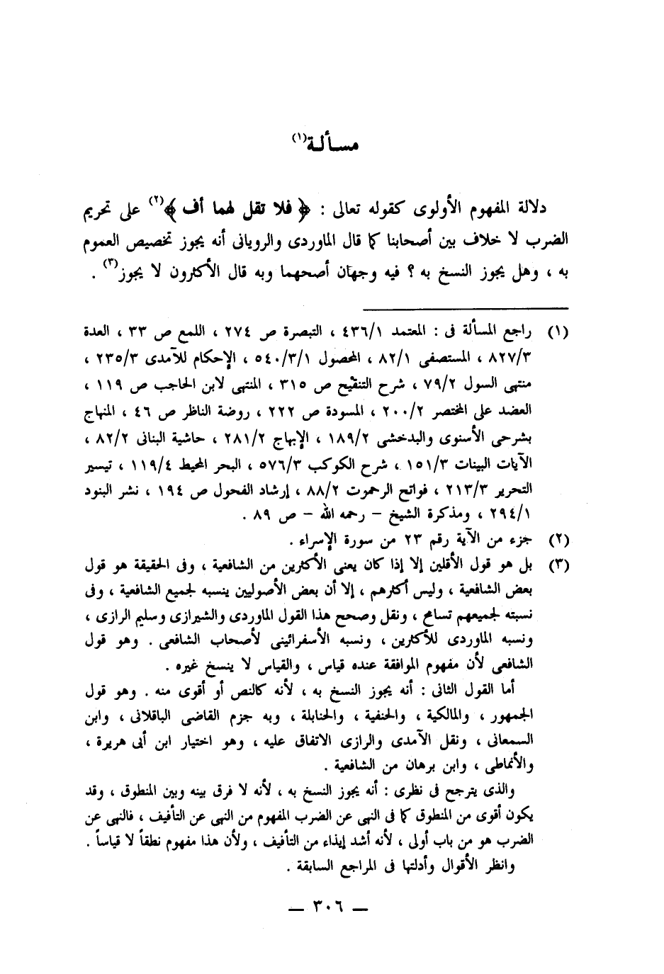 (٣) بل هو قول الأقلين إلا اذا كان يعنى الأكثرين من الشافعية، وفى الحقيقة هو قول بعض الشافعية، وليس أكثرهم، إلا أن بعض الأصوليين ينسبه لجميع الشافعية، وفى نسبته لجميعهم تسامح، ونقل وصحح هذا القول الماوردى والشيرازى وسليم الرازى، ونسبه الماوردى للأكثرين، ونسبه الأسفرائينى لأصحاب الشافعى. وهو قول الشافعى لأن مفهوم الموافقة عنده قياس، والقياس لا ينسخ غيره.