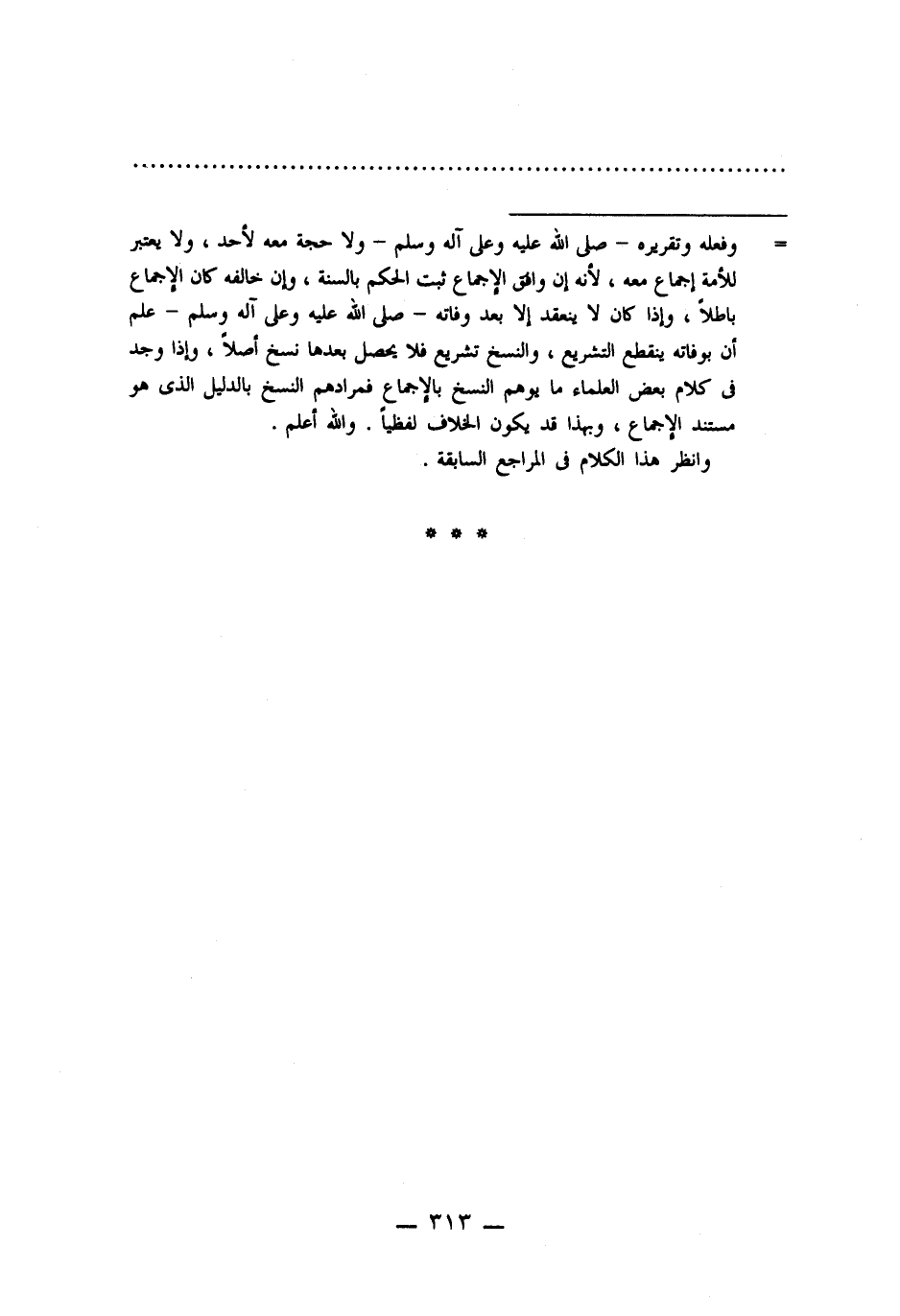 = وفعله وتقريره -صلى اللَّه عليه وعلى آله وسلم- ولا حجة معه لأحد، ولا يعتبر للأمة إجماع معه، لأنه إن وافق الإجماع ثبت الحكم يالسنة، وإن خالفه كان الإجماع باطلًا، وإذا كان لا ينعقد إلا بعد وفاته -صلى اللَّه عليه وعلى آله وسلم- علم أن بوفاته ينقطع التشريع، والنسخ تشريع فلا يحصل بعدها نسخ أصلًا، وإذا وجد فى كلام بعض العلماء ما يوهم النسخ بالاجماع فمرادهم النسخ بالدليل الذى هو مستند الإجماع، وبهذا قد يكون الخلاف لفظيًا. واللَّه أعلم.
