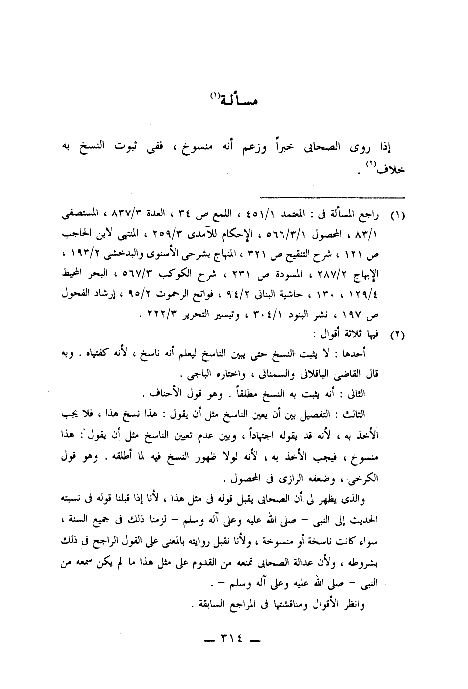 (١) راجع المسألة فى: المعتمد ١/ ٤٥١، اللمع ص ٣٤، العدة ٣/ ٨٣٧، المستصفى ١/ ٨٣، المحصول ١/ ٣/ ٥٦٦، الإحكام للآمدى ٣/ ٢٥٩، المنتهى لابن الحاجب ص ١٢١، شرح التنقيح ص ٣٢١، المنهاج بشرحى الأسنوى والبدخشى ٢/ ١٩٣، الإبهاج ٢/ ٢٨٧، المسودة ص ٢٣١، شرح الكوكب ٣/ ٥٦٧، البحر المحيط ٤/ ١٢٩، ١٣٠، حاشية البنانى ٢/ ٩٤، فواتح الرحموت ٢/ ٩٥، إرشاد الفحول ص ١٩٧، نشر البنود ١/ ٣٠٤، وتيسير التحرير ٣/ ٢٢٢.