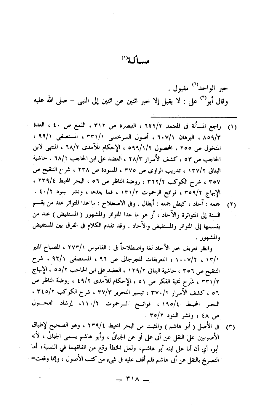 (١) راجع المسألة فى المعتمد ٢/ ٦٢٢، التبصرة ص ٣١٢، اللمع ص ٤٠، العدة ٣/ ٨٥٩، البرهان ١/ ٦٠٧، أصول السرخسى ١/ ٣٣١، المستصفى ١/ ٩٩، المنخول ص ٢٥٥، المحصول ٢/ ١/ ٥٩٩، الإحكام للآمدى ٢/ ٦٨ , المنتهى لابن الحاجب ص ٥٣، كشف الأسرار ٣/ ٢٨، العضد على ابن الحاجب ٢/ ٦٨، حاشية البنانى ٢/ ١٣٧، تدريب الراوى ص ٣٧٥، المسودة ص ٢٣٨، شرح التنقيح ص ٣٥٧، شرح الكوكب ٢/ ٣٦٢، روضة الناظر ص ٥٦، البحر المحيط ٤/ ٢٣٩، الإبهاج ٢/ ٣٥٩، فواتح الرحموت ٢/ ١٣١، فما بعدها، ونشر بنود ٢/ ٤٠.