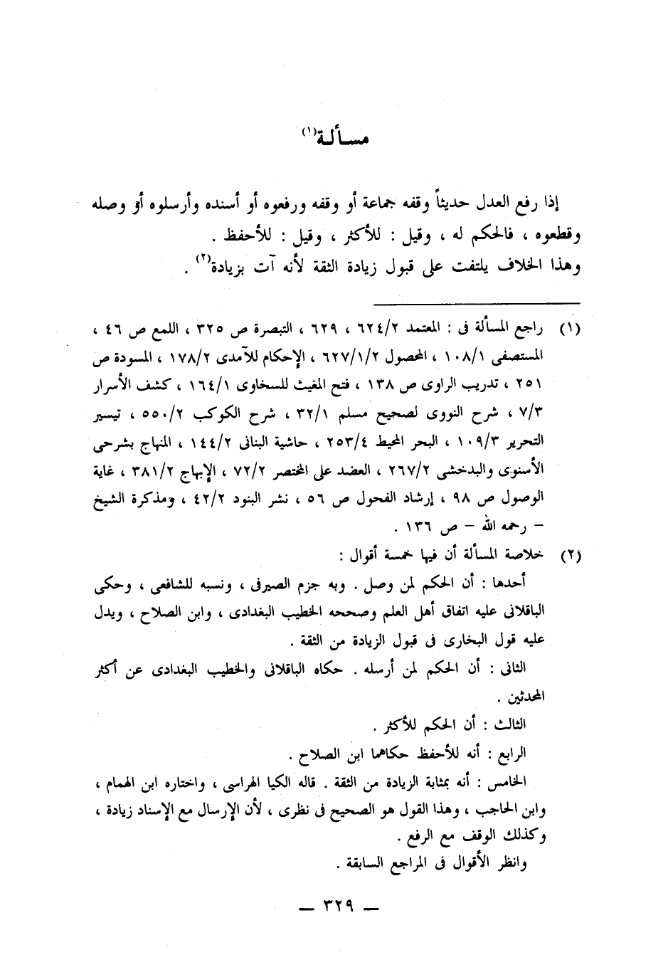 (١) راجع المسألة فى: المعتمد ٢/ ٦٢٤، ٦٢٩، التبصرة ص ٣٢٥، اللمع ص ٤٦، المستصفى ١/ ١٠٨، المحصول ٢/ ١/ ٦٢٧، الإحكام للآمدى ٢/ ١٧٨، المسودة ص ٢٥١، تدريب الراوى ص ١٣٨، فتح المغيث للسخاوى ١/ ١٦٤، كشف الأسرار ٣/ ٧، شرح النووى لصحيح مسلم ١/ ٣٢، شرح الكوكب ٢/ ٥٥٠، تيسير التحرير ٣/ ١٠٩، البحر المحيط ٤/ ٢٥٣، حاشية البنانى ٢/ ١٤٤، المنهاج بشرحى الأسنوى والبدخشى ٢/ ٢٦٧، العضد على المختصر ٢/ ٧٢، الإبهاج ٢/ ٣٨١، غاية الوصول ص ٩٨، إرشاد الفحول ص ٥٦، نشر البنود ٢/ ٤٢، ومذكرة الشيخ -رحمه اللَّه- ص ١٣٦.