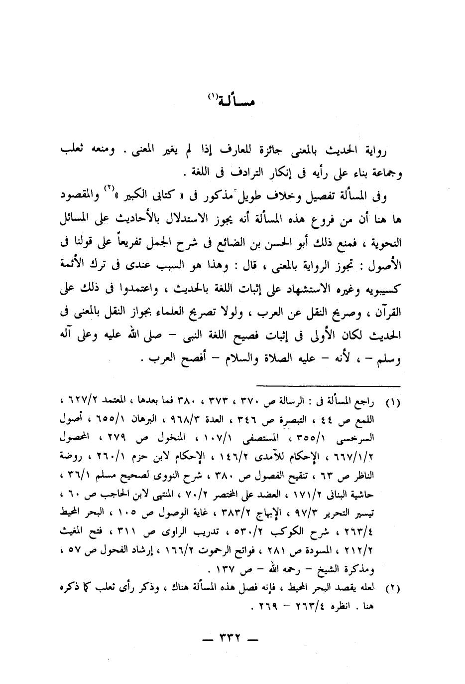 رواية الحديث بالمعنى جائزة للعارف إذا لم يغير المعنى. ومنعه ثعلب وجماعة بناء على رأيه فى إنكار الترادف فى اللغة.