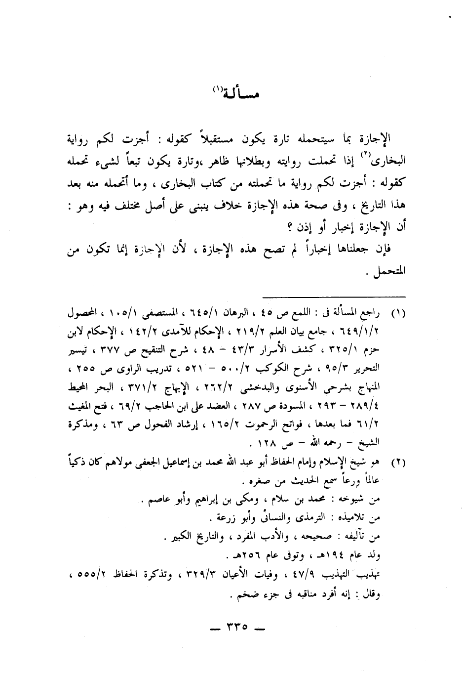 الإجازة بما سيتحمله تارة يكون مستقبلًا كقوله: أجزت لكم رواية البخارى (٢) إذا تحملت روايته وبطلانها ظاهر، وتارة يكون تبعًا لشىء تحمله كقوله: أجزت لكم رواية ما تحملته من كتاب البخارى، وما أتحمله منه بعد هذا التاريخ، وفى صحة هذه الإجازة خلاف ينبنى على أصل مختلف فيه وهو: أن الإجازة إخبار أو إذن؟