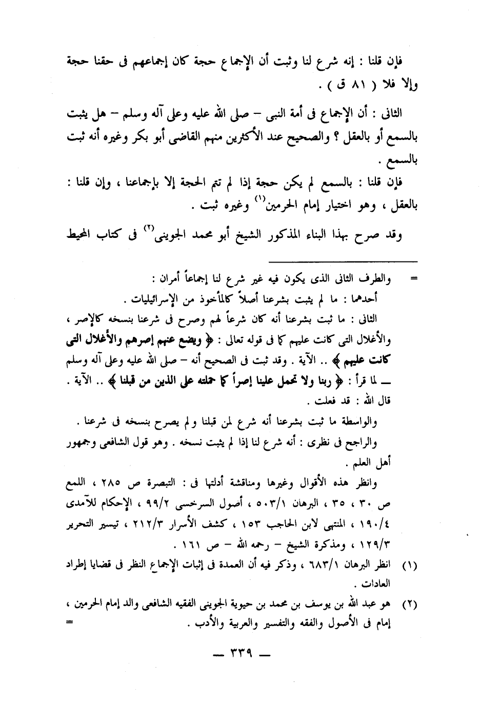 الثانى: أن الإجماع فى أمة النبى -صلى اللَّه عليه وعلى آله وسلم- هل يثبت بالسمع أو بالعقل؟ والصحيح عند الأكثرين فهم القاضى أبو بكر وغيره أنه ثبت بالسمع.
