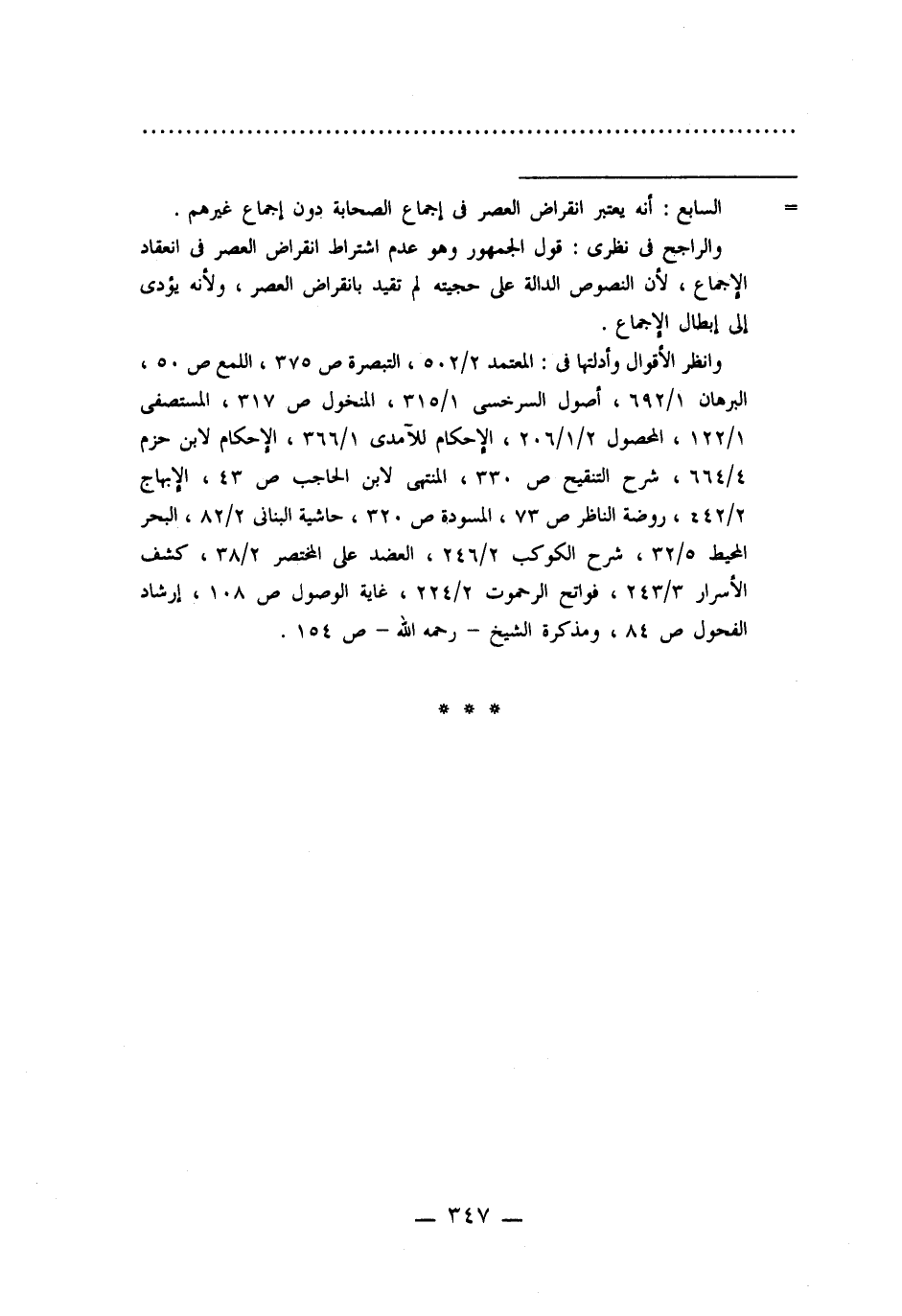 = السابع: أنه يعتبر انقراض العصر فى إجماع الصحابة دون إجماع غيرهم.