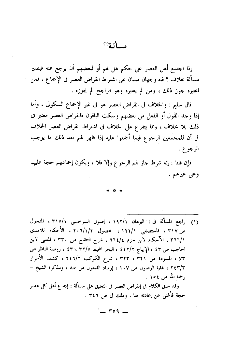 وقد سبق الكلام فى إنقراض العصر فى التعليق على مسألة: إجماع أهل كل عصر حجة فأغنى عن إعادته هنا. وذلك فى ص ٣٤٦.