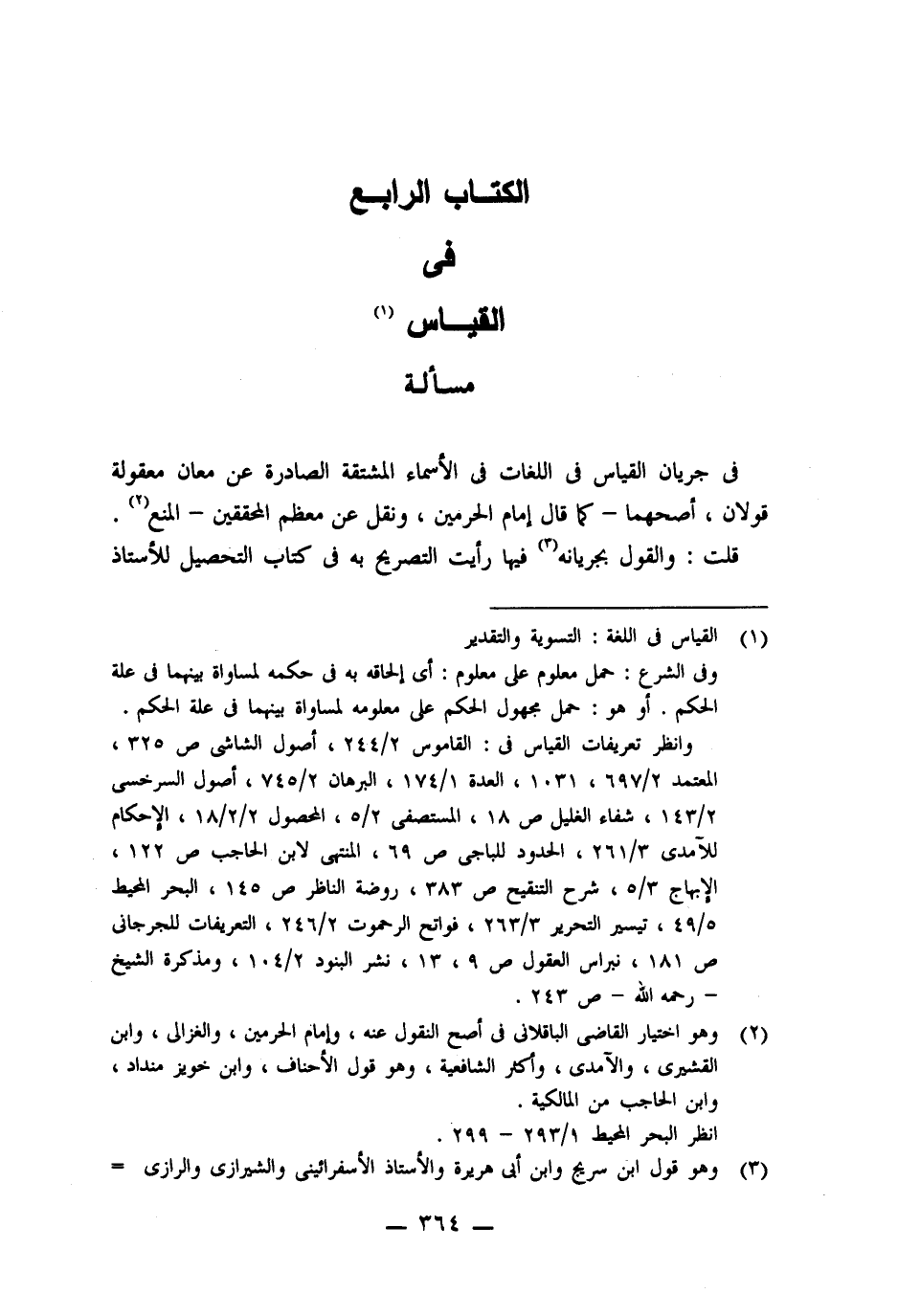 وانظر تعريفات القياس فى: القاموس ٢/ ٢٤٤، أصول الشاشى ص ٣٢٥، المعتمد ٢/ ٦٩٧، ١٠٣١، العدة ١/ ١٧٤، البرهان ٢/ ٧٤٥، أصول السرخسى ٢/ ١٤٣، شفاء الغليل ص ١٨، المستصفى ٢/ ٥، المحصول ٢/ ٢/ ١٨، الأحكام للآمدى ٣/ ٢٦١، الحدود للباجى ص ٦٩، المنتهى لابن الحاجب ص ١٢٢، الإبهاج ٣/ ٥، شرح التنقيح ص ٣٨٣، روضة الناظر ص ١٤٥، البحر المحيط ٥/ ٤٩، تيسير التحرير ٣/ ٢٦٣، فواتح الرحموت ٢/ ٢٤٦، التعريفات للجرجانى ص ١٨١، نبراس العقول ص ٩، ١٣، نشر البنود ٢/ ١٠٤، ومذكرة الشيخ -رحمه اللَّه- ص ٢٤٣.