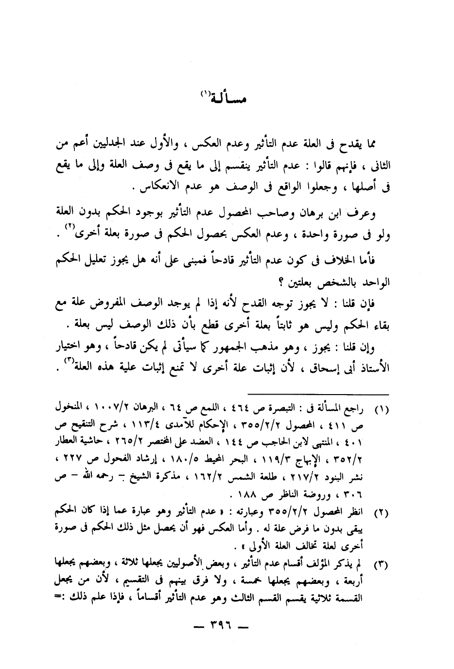 (٢) انظر المحصول ٢/ ٢/ ٣٥٥ وعبارته: "عدم التأثير وهو عبارة عما إذا كان الحكم يبقى بدون ما فرض علة له. وأما العكس فهو أن يحصل مثل ذلك الحكم فى صورة أخرى لعلة تخالف العلة الأولى".