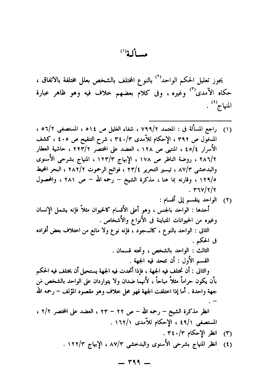 يجوز تعليل الحكم الواحد (٢) بالنوع المختلف بالشخص بعلل مختلفة بالاتفاق، حكاه الآمدى (٣) وغيره، وفى كلام بعضهم خلاف فيه وهو ظاهر عبارة المنهاج (٤).