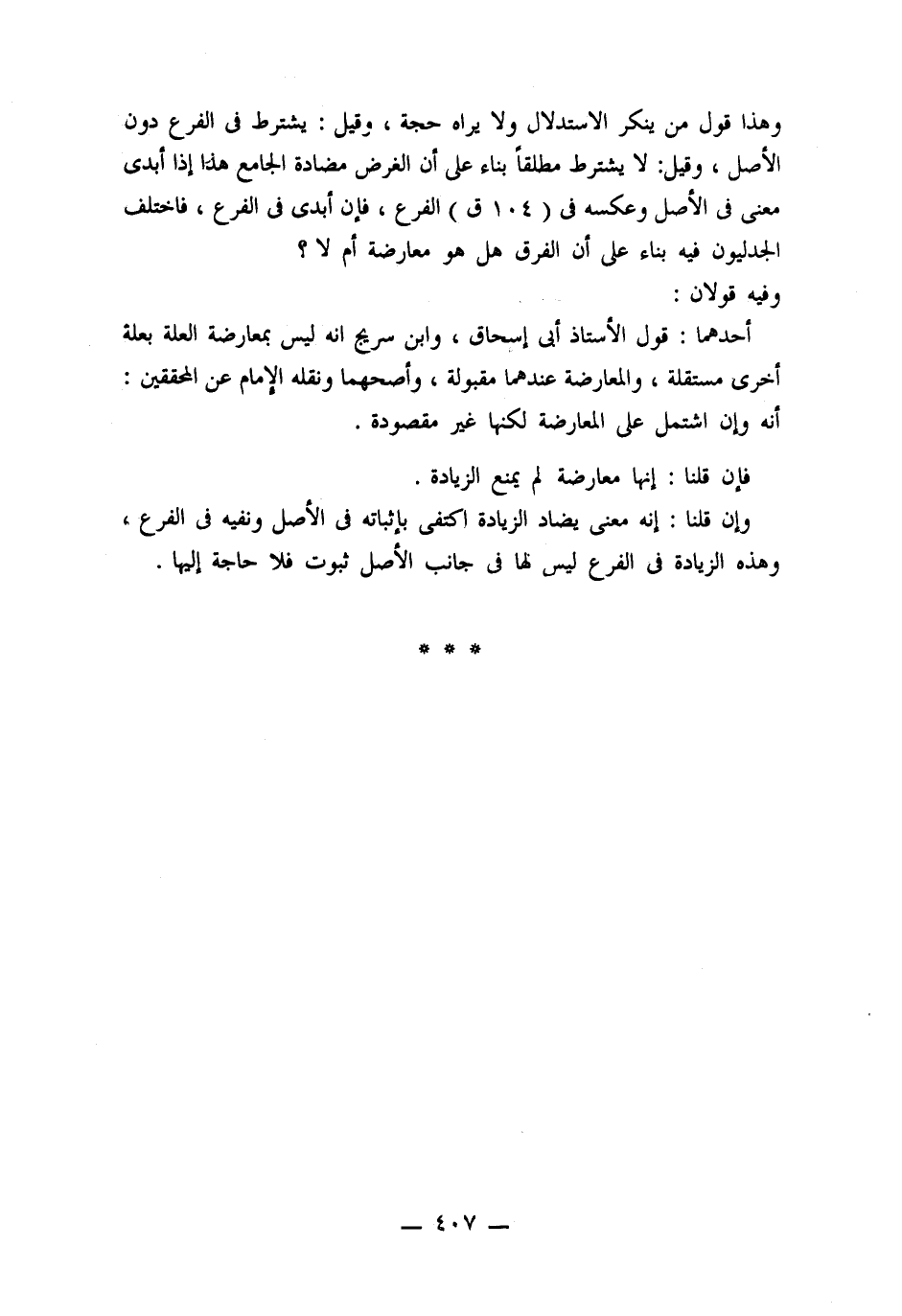 وإن قلنا: إنه معنى يضاد الزيادة اكتفى بإثباته فى الأصل ونفيه فى الفرع، وهذه الزيادة فى الفرع ليس لها فى جانب الأصل ثبوت فلا حاجة إليها.