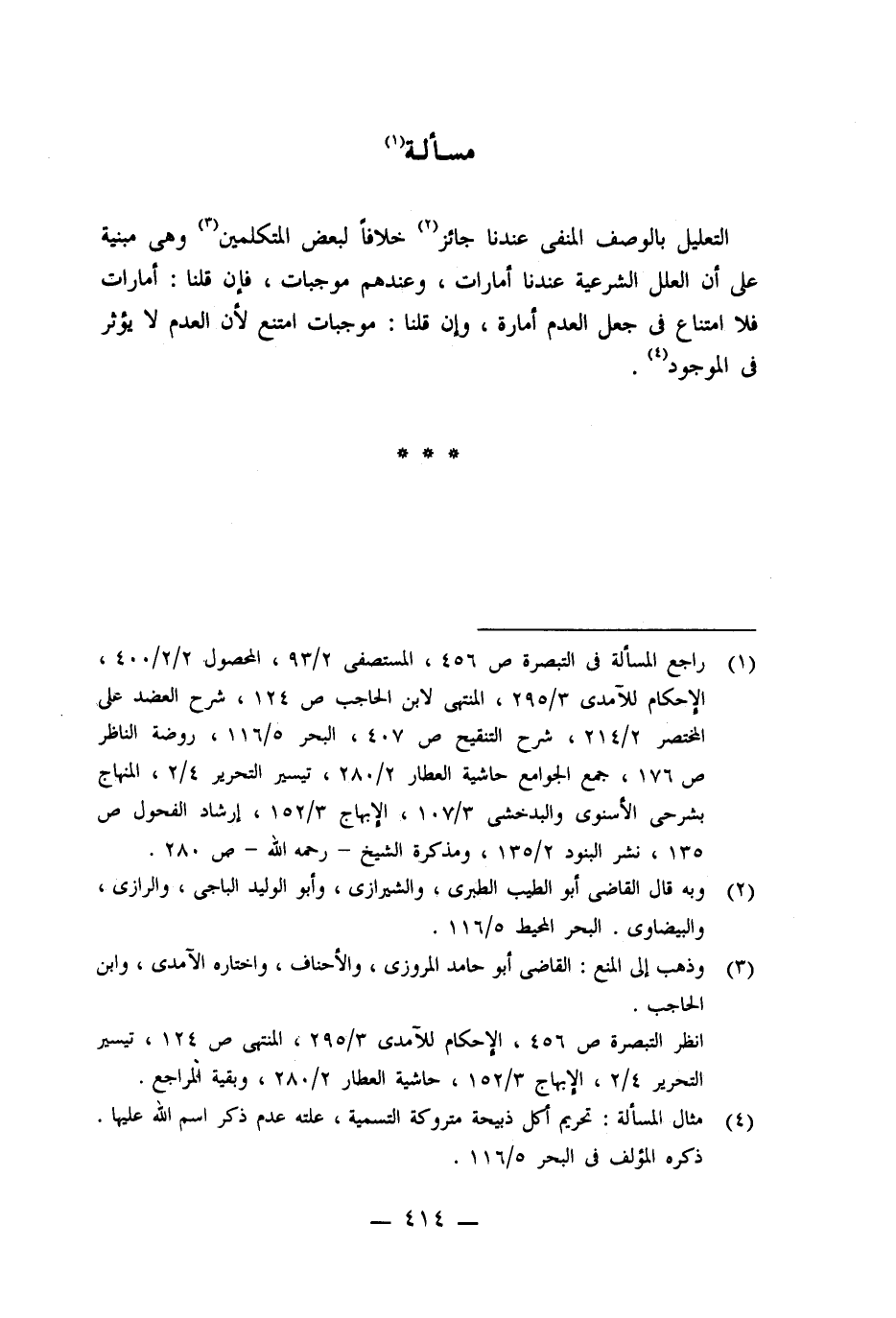 التعليل بالوصف المنفى عندنا جائز (٢) خلافًا لبعض المتكلمين (٣) وهى مبنية على أن العلل الشرعية عندنا أمارات، وعندهم موجبات، فإن قلنا: أمارات فلا امتناع فى جعل العدم أمارة، وإن قلنا: موجبات امتنع لأن العدم لا يؤثر فى الموجود (٤).