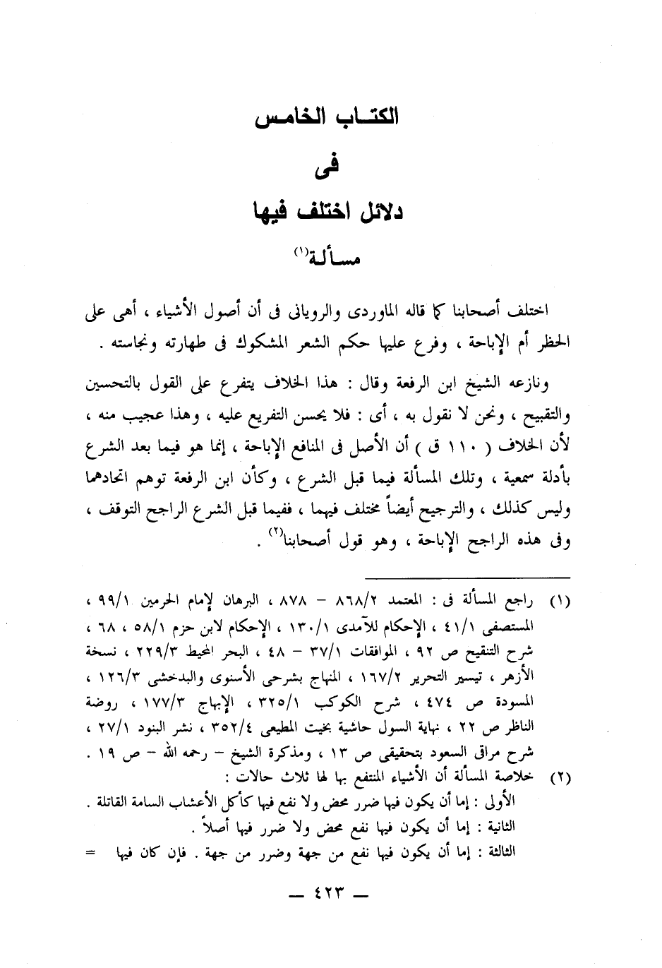 ونازعه الشيخ ابن الرفعة وقال: هذا الخلاف يتفرع على القول بالتحسين والتقبيح، ونحن لا نقول به، أى: فلا يحسن التفريع عليه، وهذا عجيب منه، لأن الخلاف أن الأصل فى المنافع الإباحة، إنما هو فيما بعد الشرع بأدلة سمعية، وتلك المسألة فيما قبل الشرع، وكأن ابن الرفعة توهم اتحادهما وليس كذلك، والترجيح أيضًا مختلف فيهما، ففيما قبل الشرع الراجح التوقف، وفى هذه الراجح الإباحة، وهو قول أصحابنا (٢).