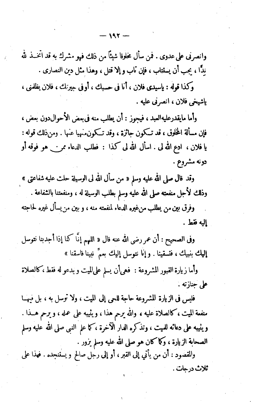 وَالْمَقْصُود أَن من يَأْتِي إِلَى الْقَبْر أَو إِلَى رجل صَالح ويستنجده فَهَذَا على ثَلَاث دَرَجَات