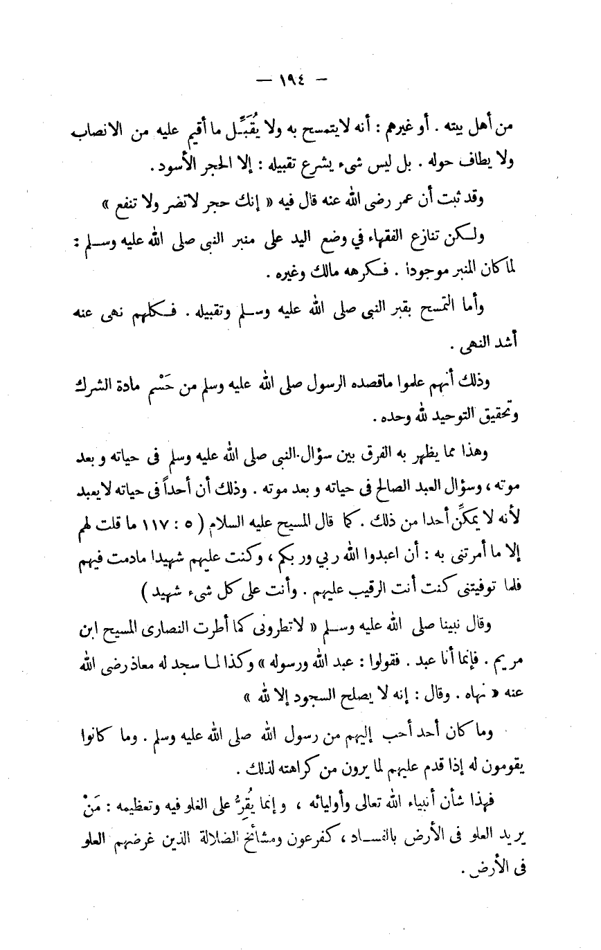 وَلَكِن تنَازع الْفُقَهَاء فِي وضع الْيَد على مِنْبَر النَّبِي صلى الله عَلَيْهِ وَسلم لما كَانَ الْمِنْبَر مَوْجُودا فكرهه مَالك وَغَيره