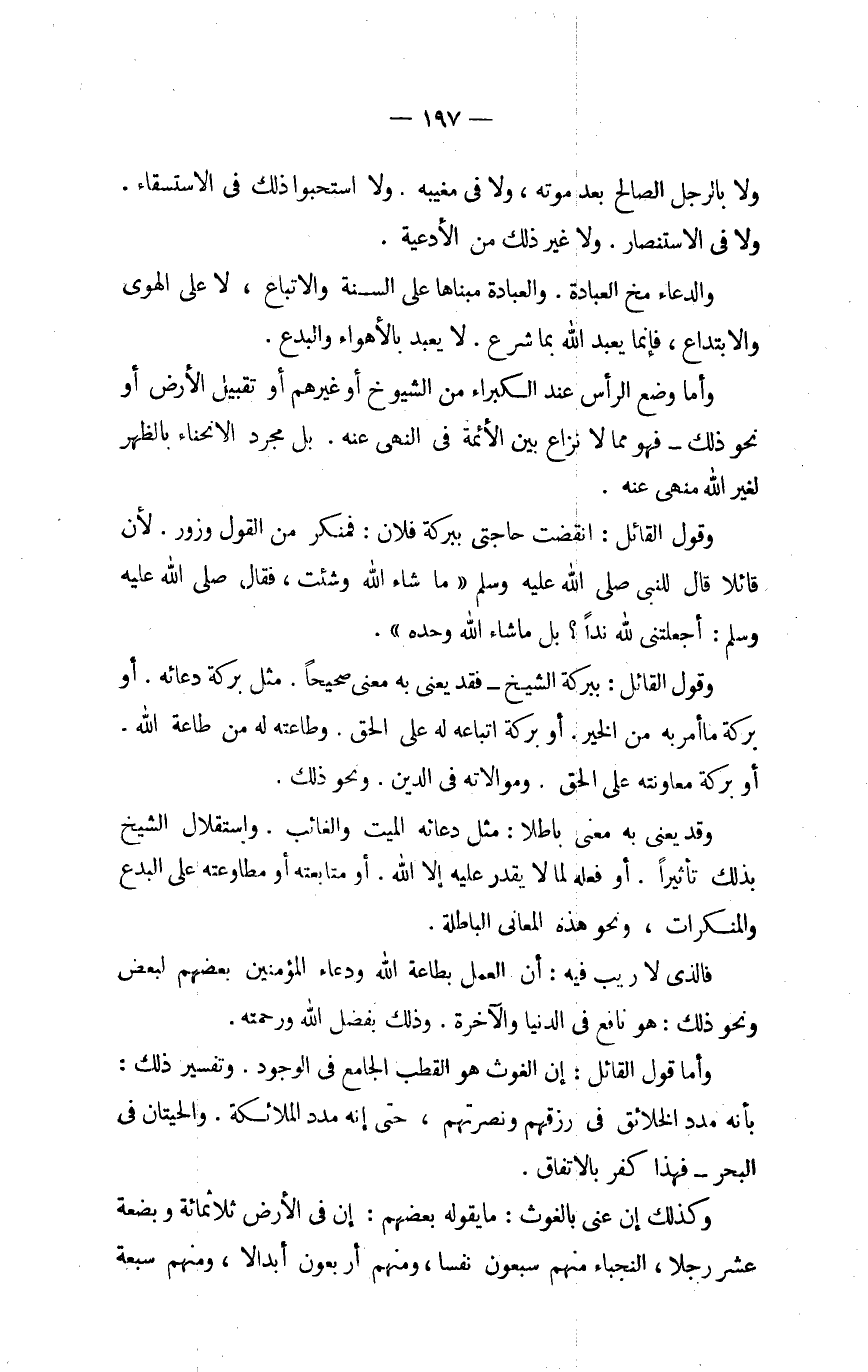وَقَول الْقَائِل ببركة الشَّيْخ فقد يَعْنِي بِهِ معنى صَحِيحا مثل بركَة دُعَائِهِ أَو بركَة مَا أَمر بِهِ من الْخَيْر أَو بركَة اتِّبَاعه لَهُ على الْحق وطاعته لَهُ من طَاعَة الله أَو بركَة معاونته على الْحق وموالاته فِي الدّين وَنَحْو ذَلِك