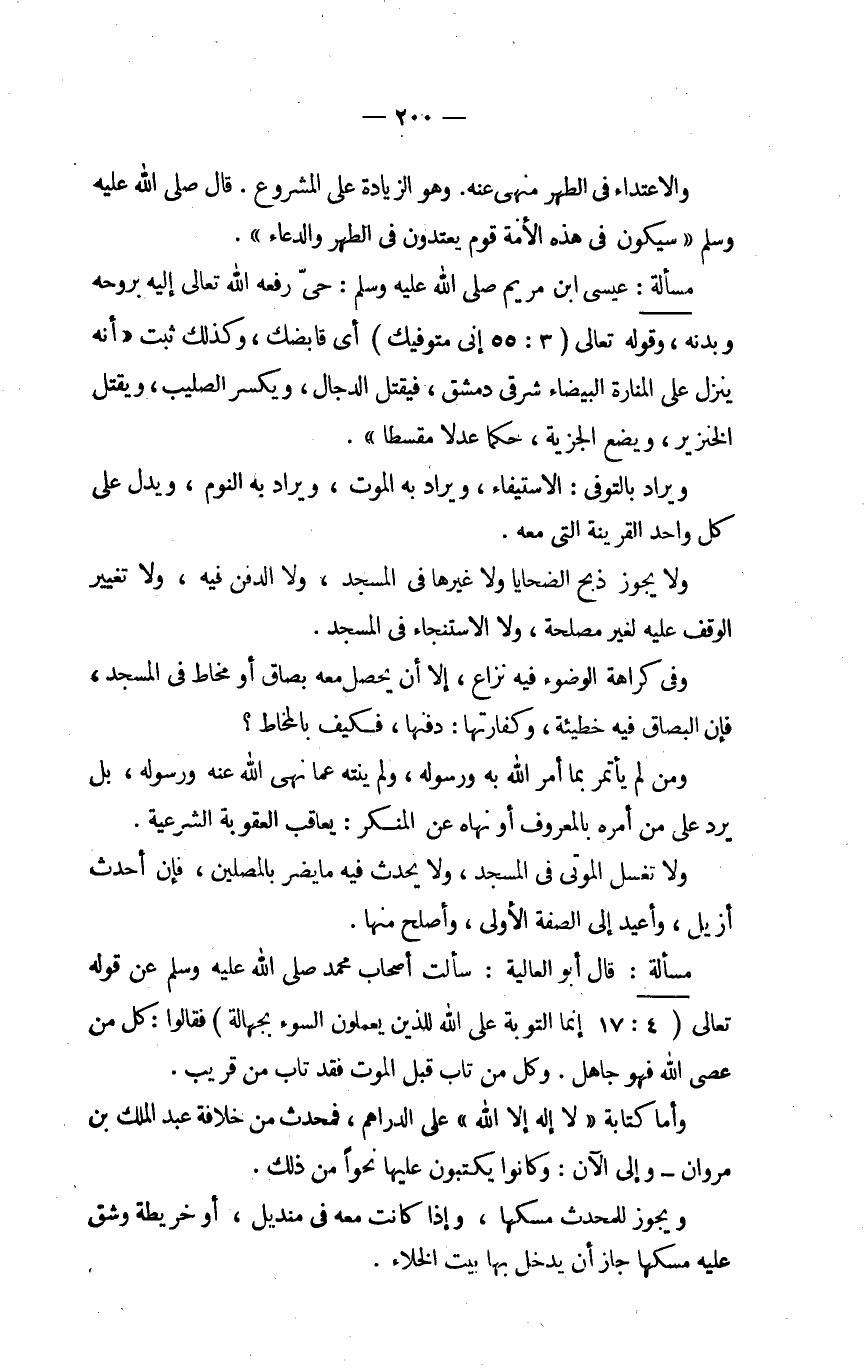 مَسْأَلَة عِيسَى بن مَرْيَم صلى الله عَلَيْهِ وَسلم حَتَّى رَفعه الله تَعَالَى إِلَيْهِ بِرُوحِهِ وبدنه وَقَوله تَعَالَى {إِنِّي متوفيك} أَي قابضك وَكَذَلِكَ ثَبت أَنه ينزل على المنارة الْبَيْضَاء شَرْقي دمشق فَيقْتل الدَّجَّال وَيكسر الصَّلِيب وَيقتل الْخِنْزِير وَيَضَع الْجِزْيَة حكما عدلا مقسطا