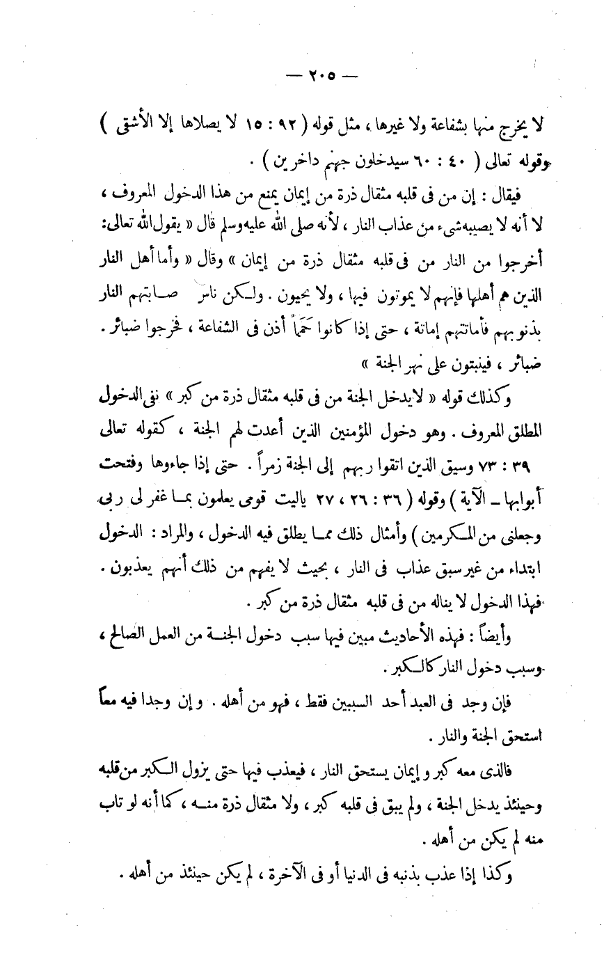 فَيُقَال إِن من فِي قلبه مِثْقَال ذرة من إِيمَان يمْنَع من هَذَا الدُّخُول الْمَعْرُوف لَا أَنه لَا يصبهُ شَيْء من عَذَاب النَّار لِأَنَّهُ صلى الله عَلَيْهِ وَسلم قَالَ يَقُول الله تَعَالَى أخرجُوا من النَّار من فِي قلبه مِثْقَال ذرة من إِيمَان وَقَالَ وَأما أهل النَّار الَّذين هم أَهلهَا فَإِنَّهُم لَا يموتون فِيهَا وَلَا يحيون وَلَكِن نَاس أَصَابَتْهُم بِذُنُوبِهِمْ فأماتتهم إمانة حَتَّى إِذا كَانَ حما أذن فِي الشَّفَاعَة فَخَرجُوا ضبائر ضبائر فينبتون على نهر الْجنَّة