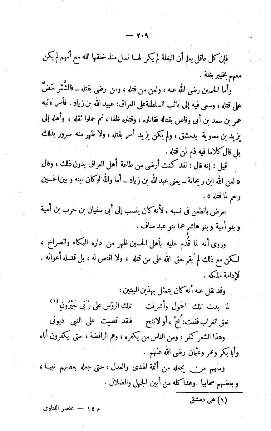 وَأما الْحُسَيْن رَضِي الله عَنهُ وَلعن من قَتله وَمن رضى بقتْله فالشمر حض على قَتله وسعى فِيهِ إِلَى نَائِب السلطنة على الْعرَاق عبيد الله بن زِيَاد فَأمر نَائِبه عمر بن سعد بن أبي وَقاص بقتاله فقاتلوه وقتلوه ظلما ثمَّ حملُوا ثقله وَأَهله إِلَى يزِيد بن مُعَاوِيَة بِدِمَشْق وَلم يكن أَمر بقتْله وَلَا ظهر مِنْهُ سرُور بذلك بل قَالَ كلَاما فِيهِ ذمّ لمن قَتله