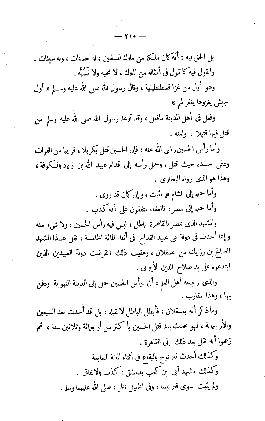 وَالَّذِي رَجحه أهل الْعلم أَن رَأس الْحُسَيْن حمل إِلَى الْمَدِينَة المنورة وَدفن بهَا وَهَذَا مقارب