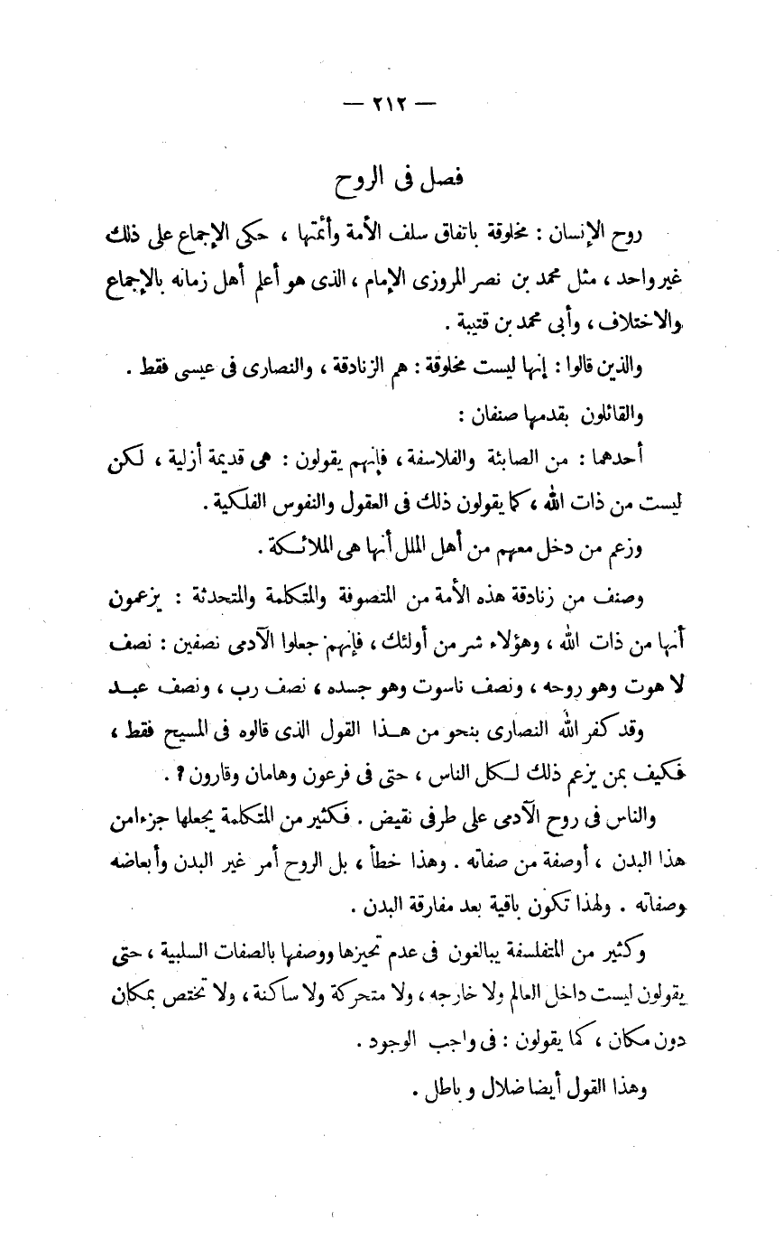 روح الْإِنْسَان مخلوقة بِاتِّفَاق سلف الْأمة وأئمتها حكى الْإِجْمَاع على ذَلِك غير وَاحِد مثل مُحَمَّد بن نصر الْمروزِي الإِمَام الَّذِي هُوَ أعلم أهل زَمَانه بِالْإِجْمَاع وَالِاخْتِلَاف وَأبي مُحَمَّد بن قُتَيْبَة