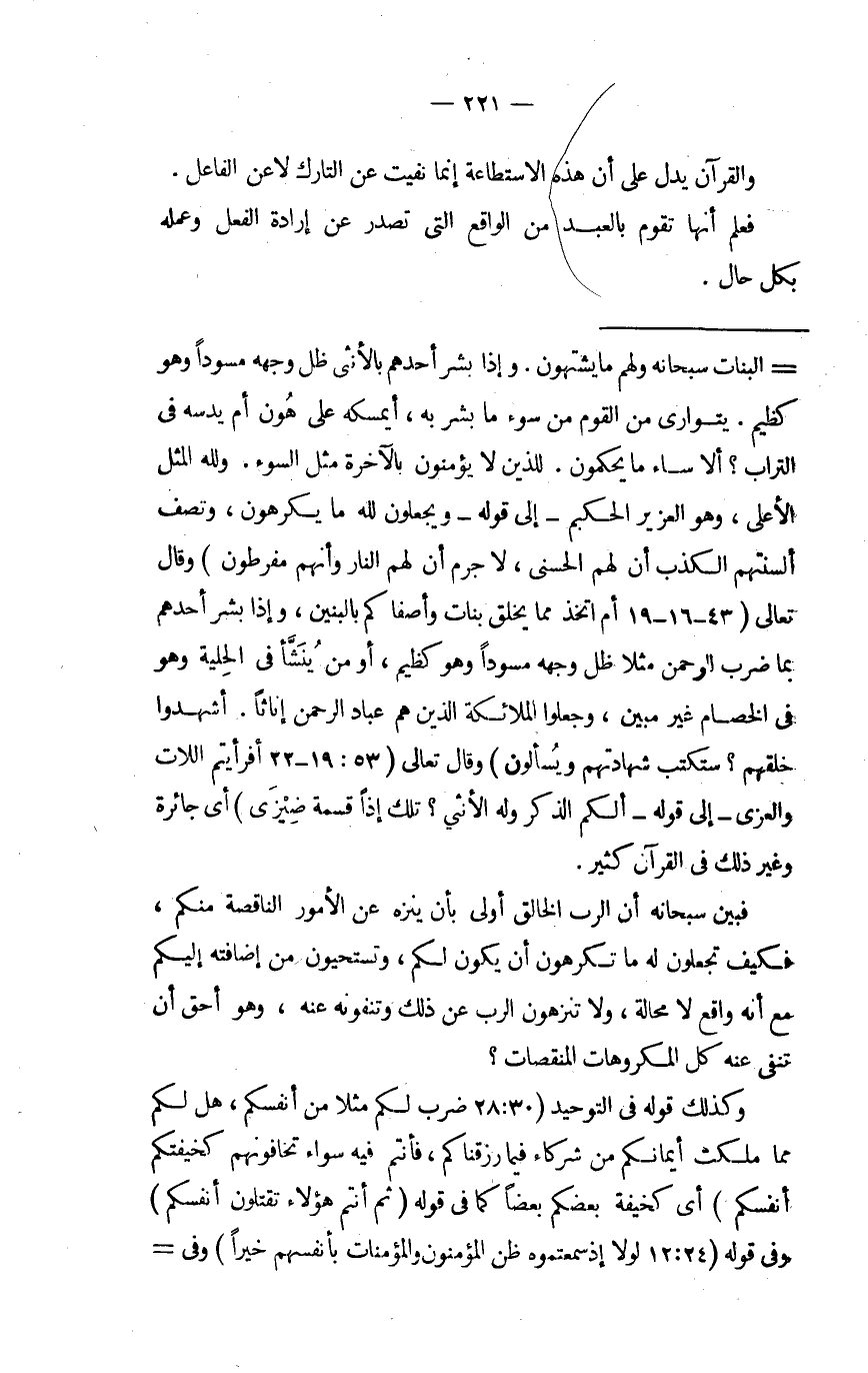 وَالْقُرْآن يدل على أَن هَذِه الِاسْتِطَاعَة إِنَّمَا نفيت عَن التارك لَا عَن الْفَاعِل فَعلم أَنَّهَا تقوم بِالْعَبدِ من الْوَاقِع الَّتِي تصدر عَن إِرَادَة الْفِعْل وَعَمله بِكُل حَال