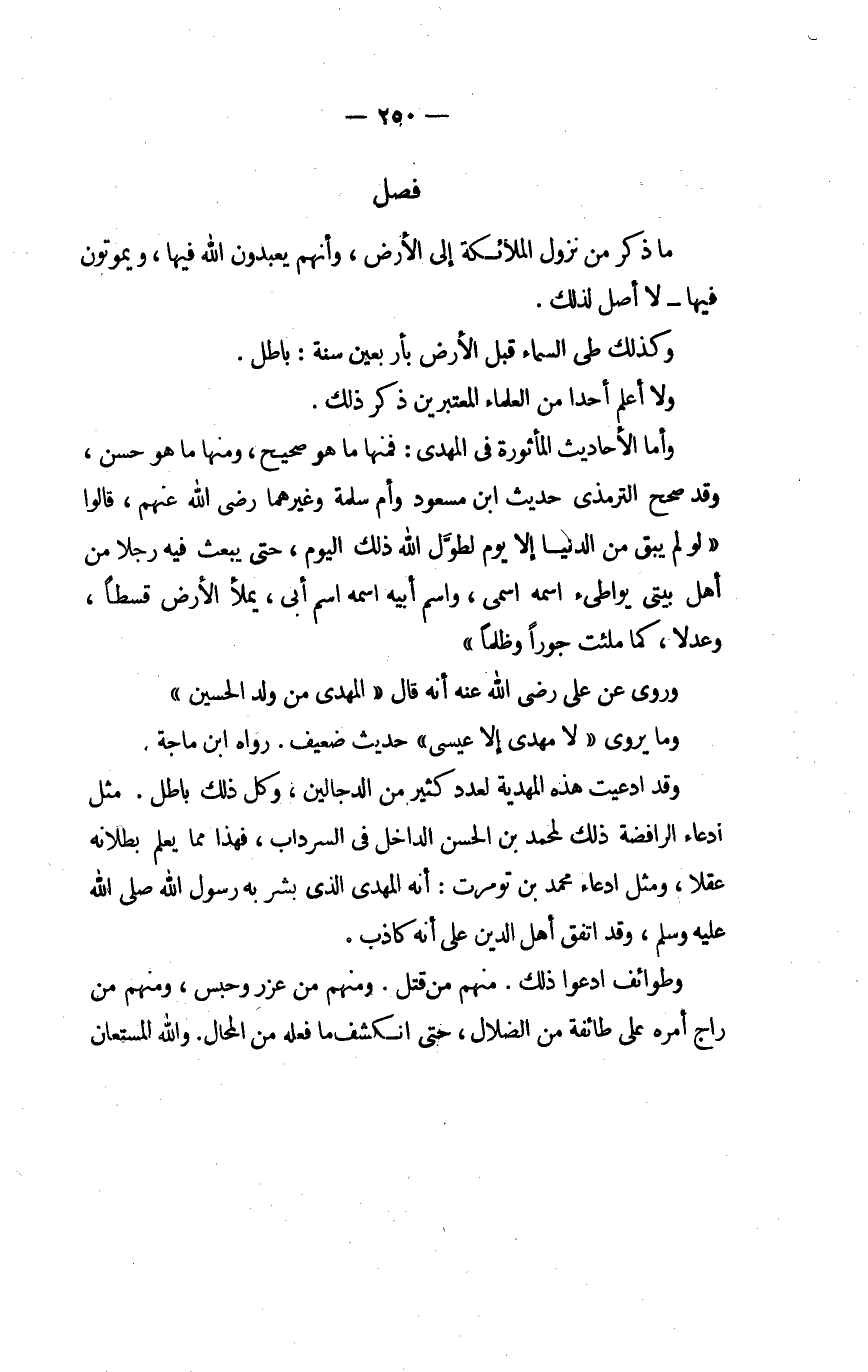 وَقد ادعيت هَذِه المهدية لعدد كثير من الدجالين وكل ذَلِك بَاطِل مثل ادِّعَاء الرافضة ذَلِك لمُحَمد بن الْحسن الدَّاخِل فِي السرادب فَهَذَا مِمَّا يعلم بُطْلَانه عقلا وَمثل ادِّعَاء مُحَمَّد بن تومرت أَنه المهدى الَّذِي بشر بِهِ رَسُول الله صلى الله عَلَيْهِ وَسلم وَقد اتّفق أهل الدّين على أَنه كَاذِب