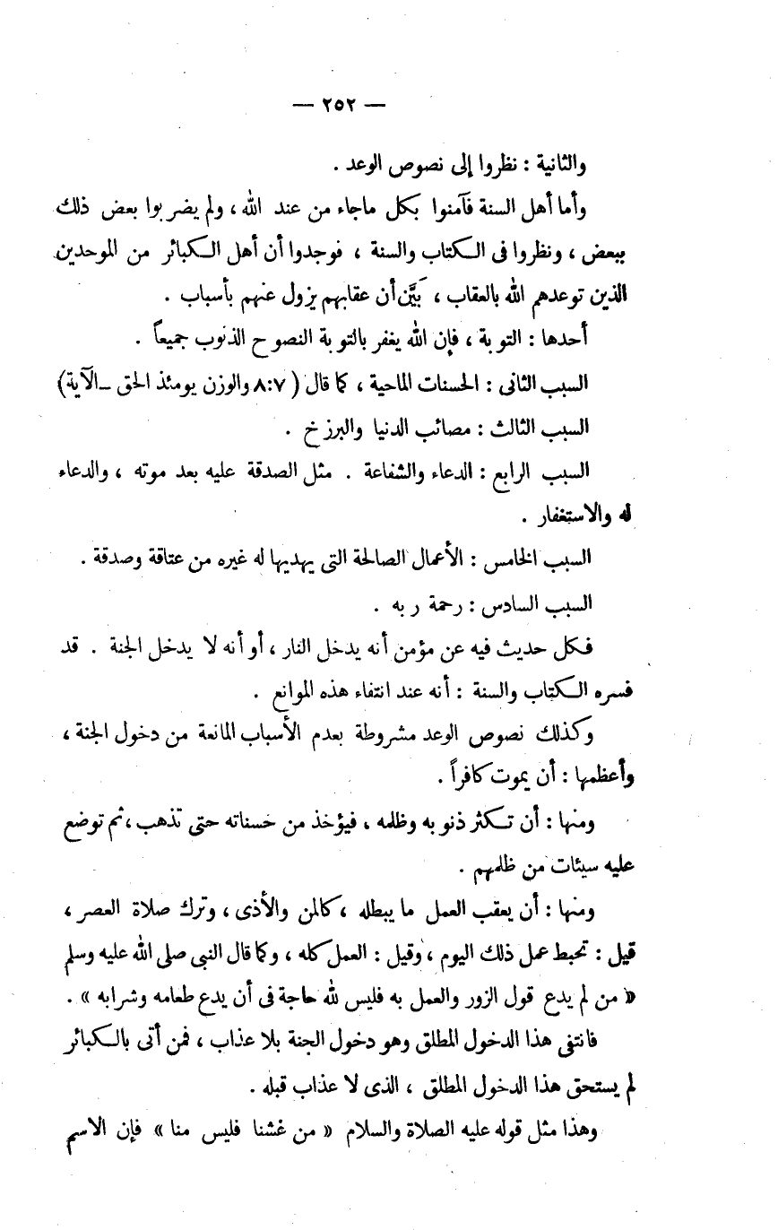 وَأما أهل اسنة فآمنوا بِكُل مَا جَاءَ من عِنْد الله وَلم يضْربُوا بعض ذَلِك بِبَعْض ونظروا فِي الْكتاب وَالسّنة فوجدوا أَن أهل الْكَبَائِر من الْمُوَحِّدين الَّذين توعدهم الله بالعقاب بَين أَن عقابهم يَزُول عَنْهُم بِأَسْبَاب