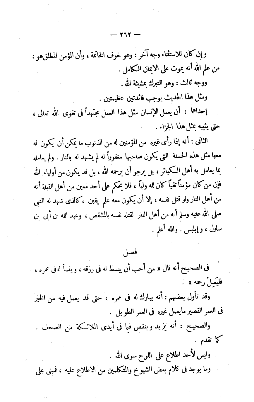 الثَّانِي أَنه إِذا رأى غَيره من الْمُؤمنِينَ لَهُ من الذُّنُوب مَا يُمكن أَن يكون لَهُ مَعهَا مثل هَذِه الْحَسَنَة الَّتِي يكون صَاحبهَا مغفورا لَهُ لم يشْهد لَهُ بالنَّار وَلم يعامله بِمَا يُعَامل بِهِ أهل الكباذر بل يرجوا أَن يرحمه الله بل قد يكون من أَوْلِيَاء الله فَإِن من كَانَ مُؤمنا نقيا كَانَ لله وليا فَلَا يحكم على أحد معِين من أهل الْقبْلَة أَنه من أهل النَّار وَلَو قتل نَفسه إِلَّا أَن يكون مَعَه علم يَقِين كَالَّذي شهد لَهُ النَّبِي صلى الله عَلَيْهِ وَسلم أَنه من أهل النَّار لقَتله نَفسه بالمشقص وَعبد الله بن أبي بن سلول وإبليس وَالله أعلم