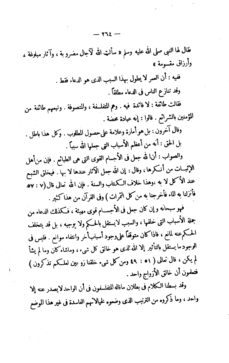 فَهُوَ سُبْحَانَهُ وَإِن كَانَ جعل فِي الْأَجْسَام قوى مهيذة فَكَذَلِك الدُّعَاء من جملَة الْأَسْبَاب الَّتِي خلقهَا وَالسَّبَب لَا يسْتَقلّ بالحكم وَلَا يُوجِبهُ بل قد يتَخَلَّف الحكم عَنهُ لمَانع فاذا كَانَ متوقفا على وجود أَسبَاب أخر وَانْتِفَاء مَوَانِع فَلَيْسَ فِي الْوُجُود مَا يسْتَقلّ بالتأثير إِلَّا الله الَّذِي هُوَ خَالق كل شئ وَمَا شَاءَ كَانَ وَمَا لم يَشَأْ لم يكن قَالَ تَعَالَى {وَمن كل شَيْء خلقنَا زَوْجَيْنِ لَعَلَّكُمْ تذكرُونَ} فتعملون أَن خَالق الْأزْوَاج وَاجِد
