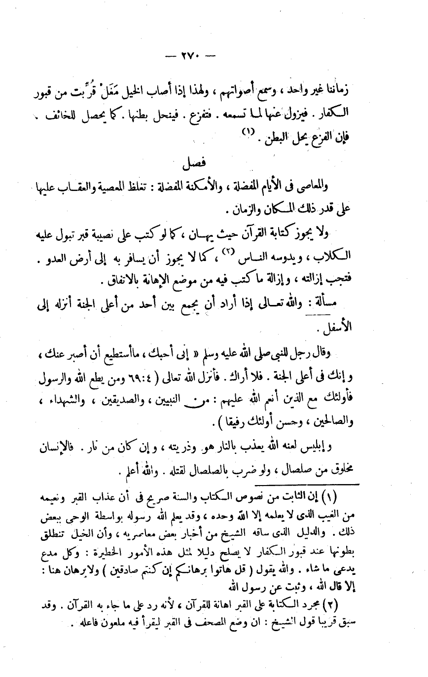 زَمَاننَا غير وَاحِد وَسمع أَصْوَاتهم وَلِهَذَا إِذا أصَاب الْخَيل مغل قربت من قُبُور الْكفَّار فيزول عَنْهَا لما تسمعه فتفزع فينحل بَطنهَا كَمَا يحصل للخائف فَإِن الْفَزع يحل الْبَطن