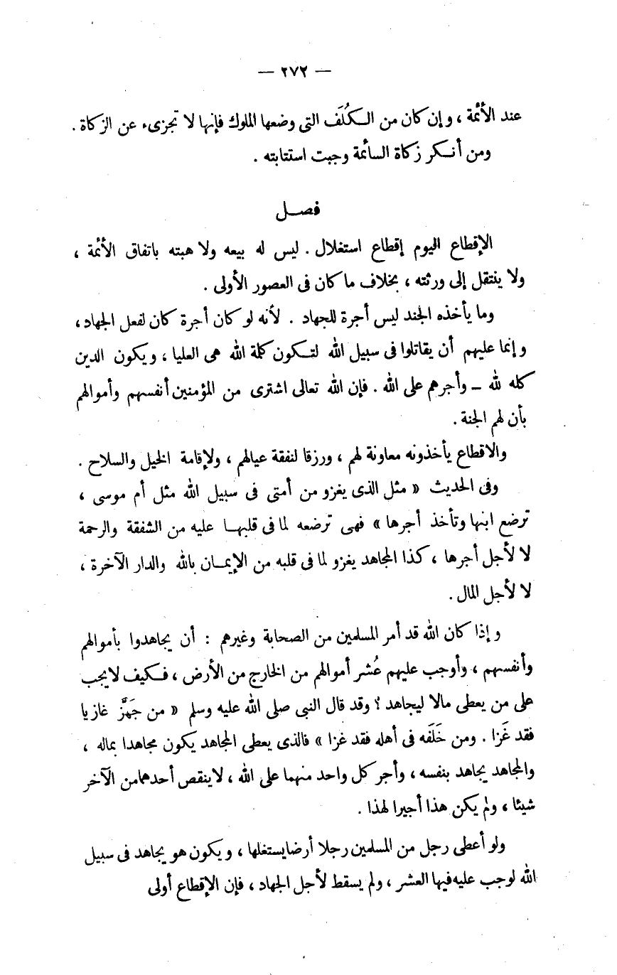 وَإِذا كَانَ الله قد أَمر الْمُسلمين من الصَّحَابَة وَغَيرهم أَن يجاهدوا بِأَمْوَالِهِمْ وأنفسهم وَأوجب عَلَيْهِم عشر أَمْوَالهم من الْخَارِج من الأَرْض فَكيف لَا يجب على من يعْطى مَالا ليجاهد وَقد قَالَ النَّبِي صلى الله عَلَيْهِ وَسلم من جهز غازيا فقد غزا وَمن خَلفه فِي أَهله فقد غزا فَالَّذِي يعْطى الْمُجَاهِد يكون مُجَاهدًا بِمَالِه والمجاهد يُجَاهد بِنَفسِهِ وَأجر كل وَاحِد مِنْهُمَا على الله لَا ينقص أَحدهمَا من الآخر شَيْئا وَلم يكن هَذَا أَجِيرا لهَذَا